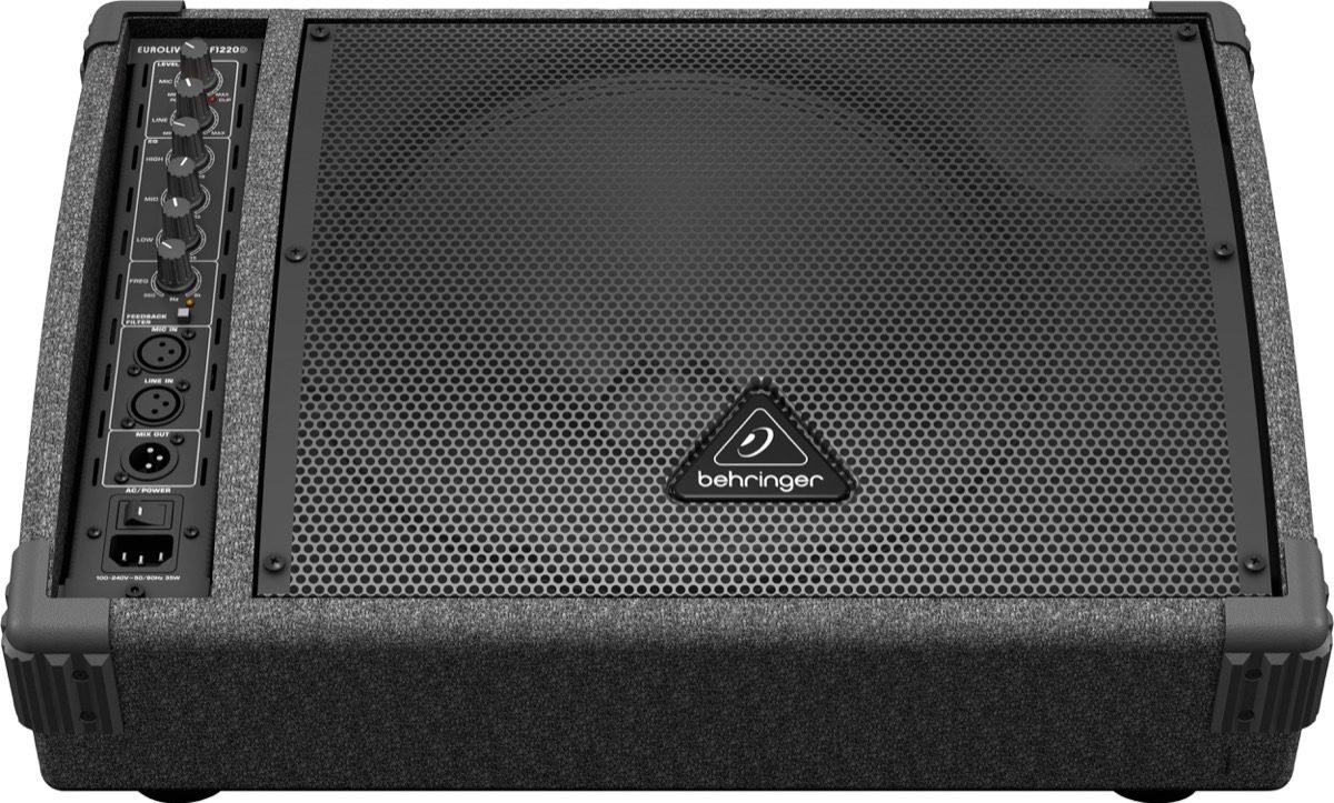 BEHRINGER F1220D. Monitor für die Bühne mit 2-Wege-Bi-Amping und 250W Leistung in Klasse D. Die technischen Merkmale umfassen ein elektronisches 2-Wege-Crossover, einen 12" Langhublautsprecher, einen 3" Kompressionstreiber, einen integrierten 2-Kanal-Mixer mit Mic/Line-Eingängen über XLR und unabhängigen Lautstärkereglern, einen 3-Band-Equalizer, integrierte Feedback-Filter und Limiter, Mix-Ausgang über XLR zum Anschluss weiterer Lautsprecher.