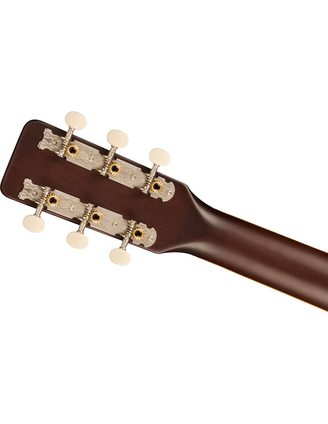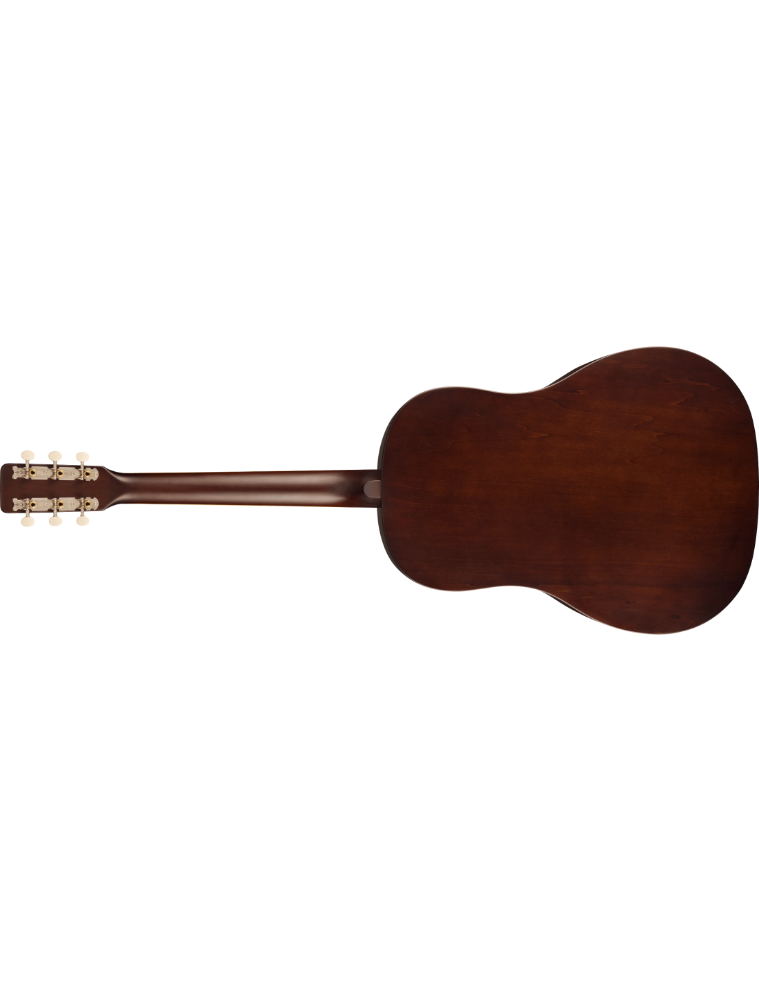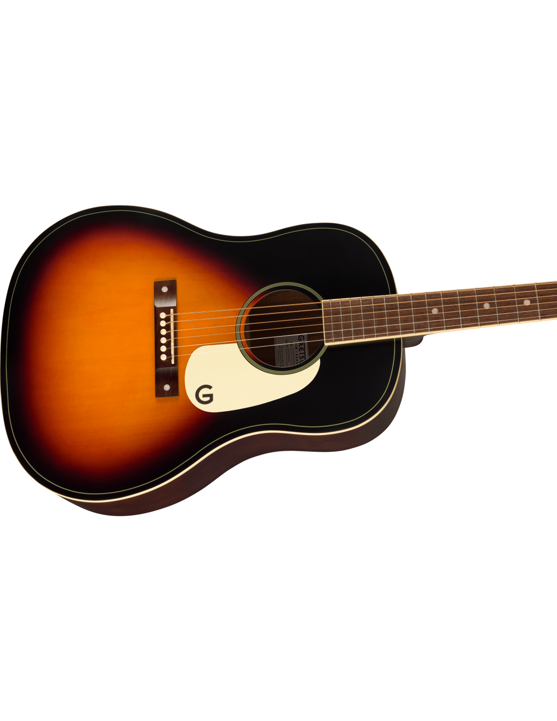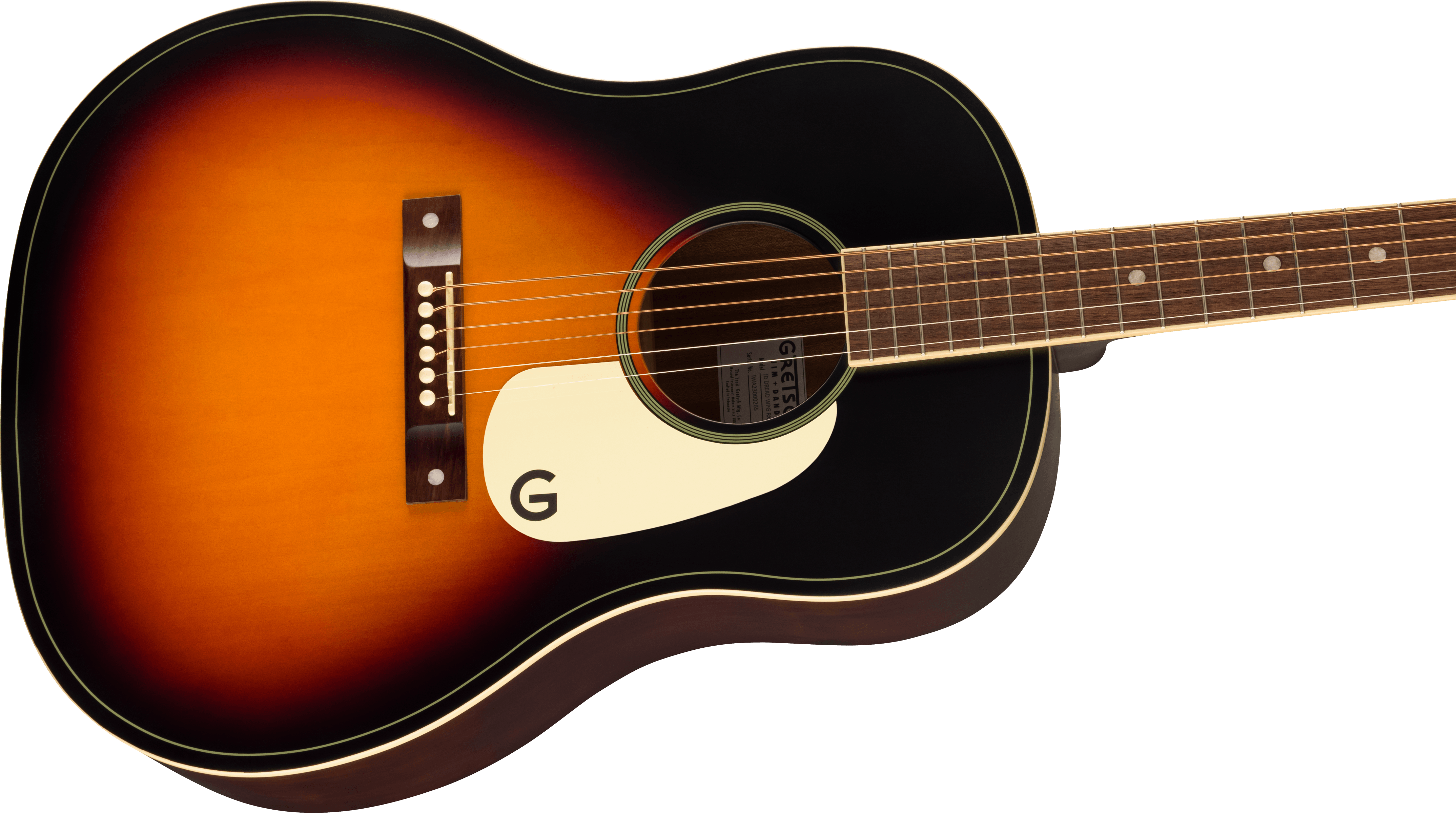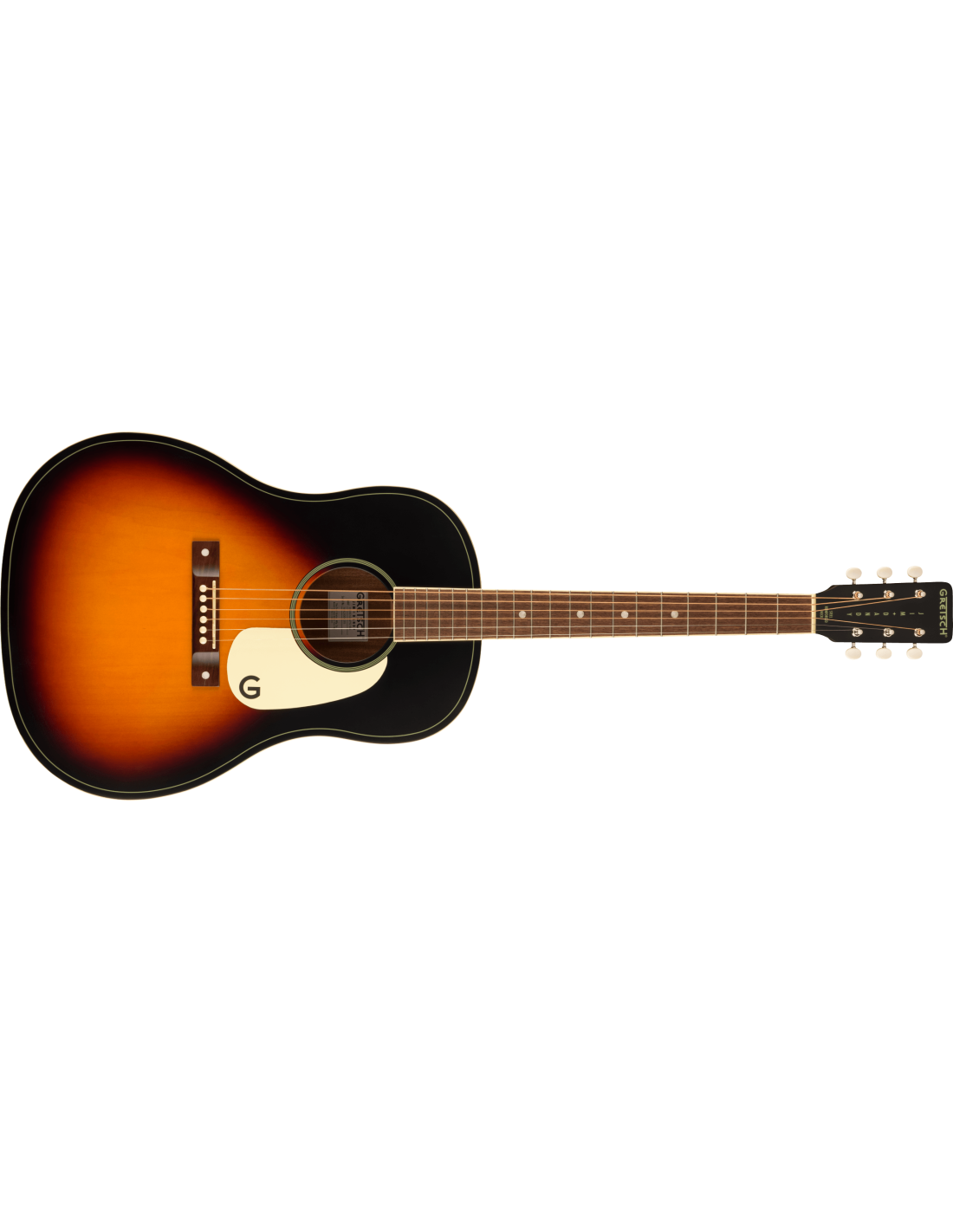 GRETSCH JIM DANDY DREADNOUGHT REX BURST ist eine Dreadnought-Akustikgitarre im verkleinerten Format, Serie Jim Dandy Deltoluxe Dreadnought, mit einer Decke, einem Boden und Zargen aus laminiertem Lindenholz und X-Bracing, einem Nato-Hals in "C"-Form, einem 1950er Gretsch 3x3 Kopf, einem 12" Radius Walnussgriffbrett mit 20 Vintage-Bünden und White Pearloid Dot Einlagen, einem Sattel aus synthetischem Knochen, Nickel-Hardware, gegossenen Open-Gear Mechaniken und einer Walnussbrücke mit einer Sattel aus Sperrholz.