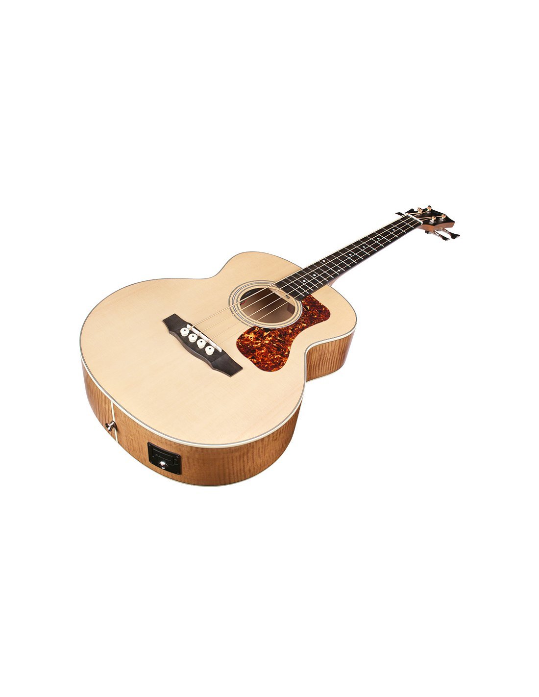 Wir haben eine massive Sitka-Fichten-Decke und einen gewölbten Boden aus geflammtem Ahorn ausgewählt, die seit Jahrhunderten im Bau von Kontrabässen verwendet werden, um einen tiefen und definierten Klang zu erzeugen, der für ein so kleines Instrument unvorstellbar ist. Der Boden, die Zargen und der Hals sind mit einem antiken satinblonden Finish versehen, das durch die wunderschönen Holzmaserungen Tiefe und einzigartigen Charakter verleiht. Die tiefe und volle Stimme des Jumbo Junior kann mit dem speziell für Guild entworfenen aktiven Fishman Sonitone BT-1 Pickup für Bass verstärkt oder aufgenommen werden; das System umfasst eine Lautstärkeregelung und eine für die Höhen. Weitere wichtige Merkmale sind das Griffbrett und die Brücke aus Ebenholz, der Sattel (41 mm) und der Steg aus Knochen, die Rosette aus Perlmutt, das Guild-Logo aus Perlmutt auf dem Kopfstück, der Schlagbrett aus tortoise-farbenem Celluloid und die Phosphorbronze-Saiten mit Nylonkern. Das satinierte Finish ist natur für die Decke und blond für die Zargen und den Boden, was es einzigartig in der modernen Guild-Produktion macht.