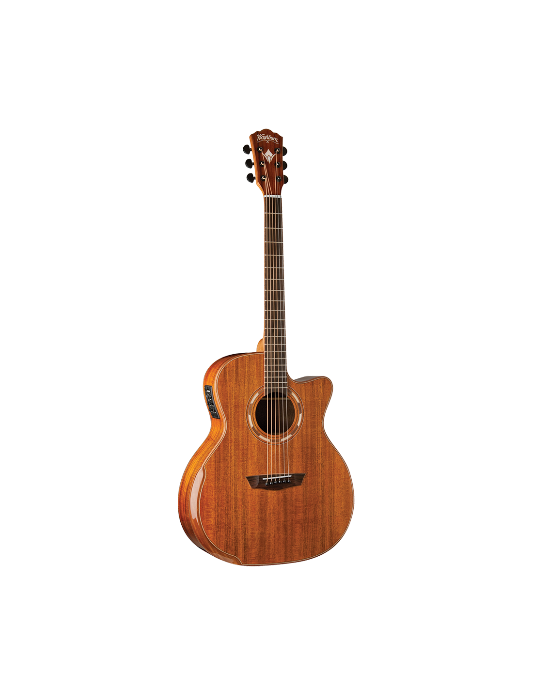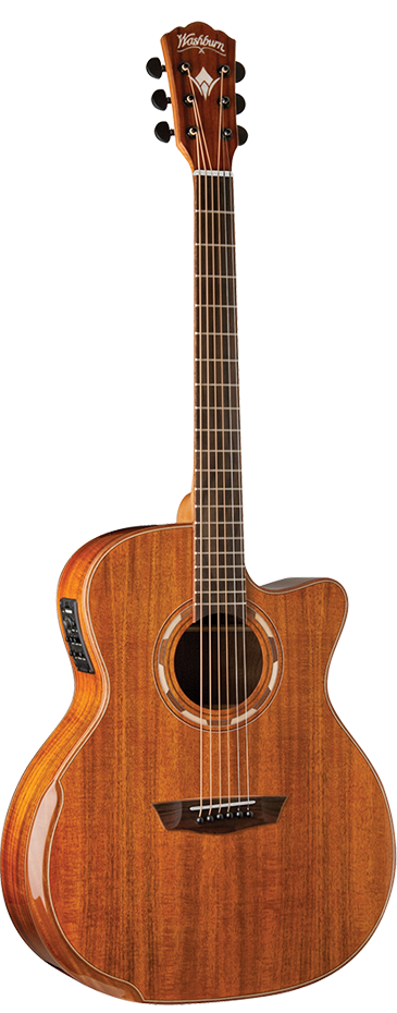 Akustische E-Gitarre Grand Auditorium Cutaway, Koa-Decke, Koa-Boden und -Zargen, Fishman Presys+ 501T Vorverstärker, Komfort-Armauflage, Hochglanz-Naturfinish. Die G55SCE ist eine akustische E-Gitarre im Grand Auditorium-Stil mit venezianischem Cutaway. Das originale Merkmal der Comfort-Serie ist die ergonomische Armauflage, die maximalen Komfort bietet und im Fall der G55SCE ein integraler Bestandteil der wunderschönen Mahagoni-Bindung wird. Die Gitarre verfügt über eine Koa-Decke, Koa-Boden und -Zargen, Korpus und Kopfplatte sind mit Mahagoni/Ahorn eingefasst. Das unbeschriftete Ovangkol-Griffbrett und die mit Mahagoni eingefasste Ovangkol-Brücke verleihen der Gitarre eine Aura schlichter Eleganz. Ein Streifen aus Ahorn/Mahagoni/Ahorn teilt auch die Rückseite aus Koa. Die Kopfplatte zeigt ein perlmutternes Washburn-Logo und ein stilisiertes W. Die wunderschöne Rosette im Washburn Parquet-Stil besteht aus abwechselndem Ahorn und Mahagoni. Die G55SCE ist bereits von Natur aus eine Gitarre mit fantastischem Klang, aber die Hinzufügung des hochwertigen Fishman + 501T Vorverstärkers macht die Gitarre außergewöhnlich für verstärkte Auftritte. SPEZIFIKATIONEN Form: Grand Auditorium Decke: Koa Boden/Zargen: Koa Hals: Satiniertes Mahagoni, 2-Wege-Truss Rod Griffbrett: Ovangkol Rosette: Washburn Parquet 3Ring Verstärkung: Cathedral Peaked Scalloped - X Brücke: Mahagoni mit Ovangkol-Bindung Sattel: Knochen Mechaniken: 18:1 Schwarz Vorverstärker: Fishman Presys + 501T Anzahl der Bünde: 20 Bünde Mensur: 25 5/16 Farbe: Natur Finish: Hochglanz Saiten: D’Addario EXP16