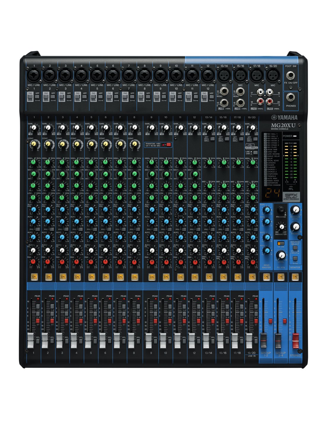 YAMAHA MG20XU ist ein 20-Kanal-Mixer mit USB-Anschluss und integrierten digitalen Effekten. Die technischen Merkmale umfassen 12 Combo-Eingänge XLR/TRS Neutrik mit D-PRE-Mikrofonvorverstärkern mit 26dB Pad und 80Hz HPF, 4 Stereo-Eingänge über XLR und doppelte TRS, 4 Gruppenbusse plus 1 Stereo-Bus, One-Knob-Kompressor auf den ersten 8 Kanälen, Phantomspannung +48V, 3-Band-Equalizer auf den Mikrofoneingängen mit FX-Level und Gain-Regelung, 4 Stereo-Kanäle mit TRS/RCA-Anschlüssen und 2-Band-Equalizer. Es verfügt über einen SPX-Multieffektprozessor mit 24 digitalen Effekten, Aux Send/Return über TRS, symmetrische XLR-Ausgänge, Stereo-Ausgang, Monitor, Gruppe über TRS.
