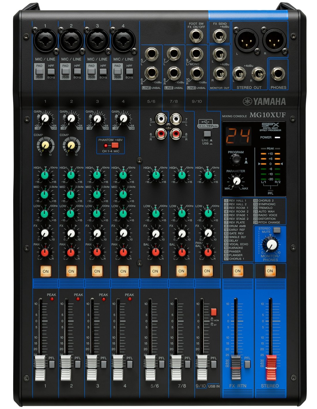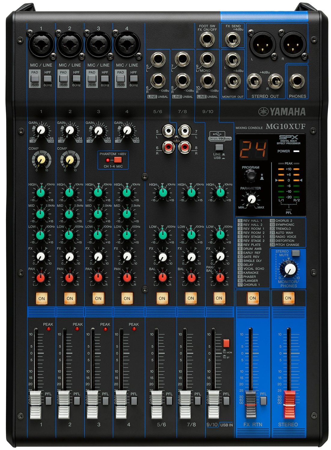 YAMAHA MG10XUF ist ein 10-Kanal-Mixer mit USB-Anschluss und integrierten digitalen Effekten. Die technischen Merkmale umfassen 4 Combo-Eingänge XLR/TRS Neutrik mit D-PRE-Mikrofonvorverstärkern mit 26dB Pad und 80Hz HPF, einen One-Knob-Kompressor auf den ersten 2 Kanälen, Phantomspannung +48V, 3-Band-Equalizer auf den Mikrofonkanälen mit FX-Level und Gain-Kontrolle, 3 Stereo-Kanäle mit TRS/RCA-Anschlüssen und 2-Band-Equalizer. Er verfügt über einen SPX-Multieffektprozessor mit 24 digitalen Effekten, symmetrische XLR-Ausgänge, Stereo-Ausgang und Monitoring über TRS. Enthält die Software Cubase Al DAW
