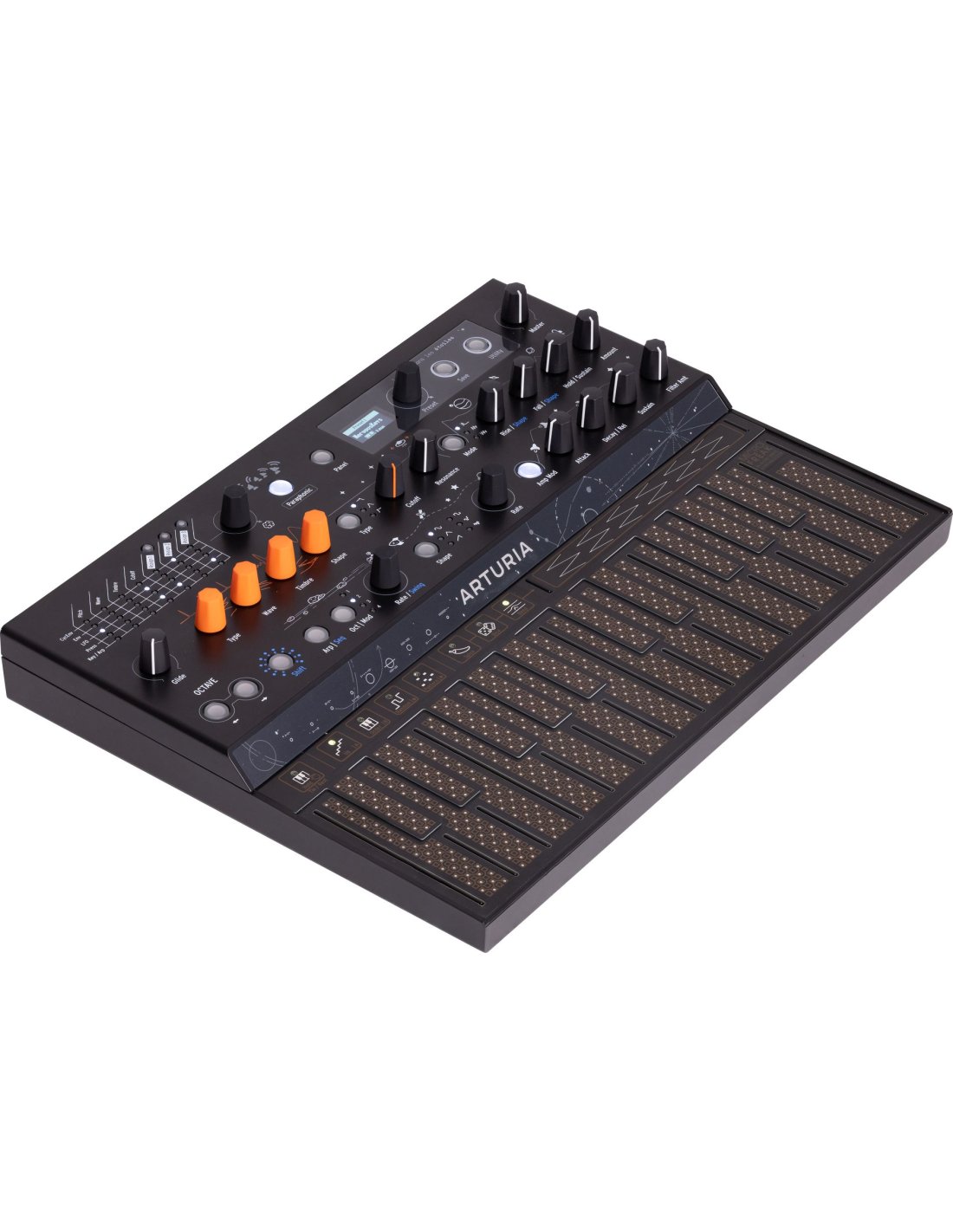 Der Microfreak Stellar ist ein hybrider analog-digitaler Synthesizer von Arturia. Er verfügt über 21 digitale Oszillatoren, einen Synthesizer mit 267 Preset-Slots, ADSR-Hüllkurven und Cycling, LFO mit Sync, Arpeggiator, analoges Filter mit variablem Zustand und einen 64-Step-Sequenzer.