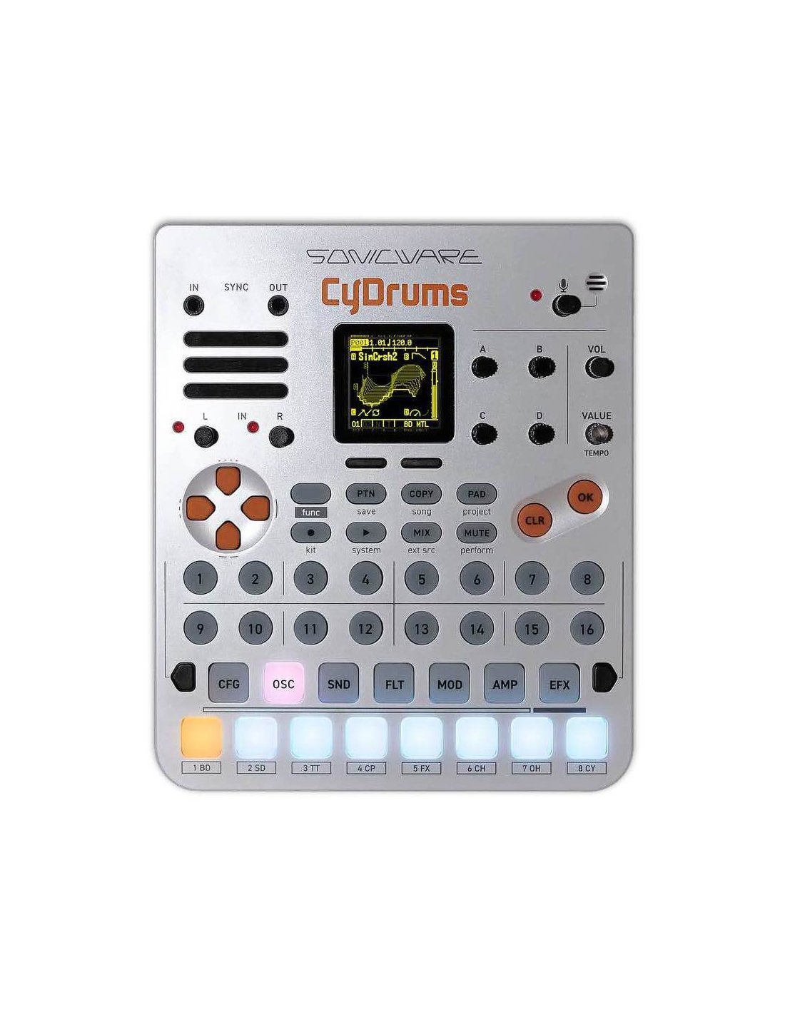 Drum-Synthesizer, der Velocity und Druck der Tasten nutzt, um den Klang zu steuern, ausgestattet mit einem dualen Wavetable-Oszillator, 22 Klangstrukturen für Bassdrum, Snare, Hi-Hat, Tom, Bass und hohe Instrumente, 64 Wavetables mit bis zu 256 Wellenformen, 520 vorgefertigte Klangpatches, 2 Insert-Effekte, Hall- und Mastereffekte mit flexiblem Routing, 8-spuriger Sequencer / 128 Schritte mit Poly-Rhythmen und verschiedenen Optionen für die Performance (Varispeed, Snip Loop, Random und Drum Roll), Modulationsoptionen für Velocity und Aftertouch (mit Kontrolle über 60 Parameter), Tiefpass-, Hochpass-, Bandpass-, Shelf- und parametrische EQs für jede Spur, Speicherung von 128 Modellen pro Projekt, 256 Projekte, 1024 Audio-Patches, 128 Drum-Kits, 15 drucksensitive Pads und Aftertouch, integrierter Lautsprecher und Mikrofon, 2 In-Audio-Jack TRS 6,3 mm, 2 Out-Audio-Jack TRS 6,3 mm, In und Out MIDI, In und Out AudioSync mit 3,5 mm Jack, Kopfhörerausgang, USB-Port, Abmessungen 147 x 175 x 46 mm, Gewicht: 0,55 kg. Enthält Netzteil und 32 GB SD-Karte mit Presets.