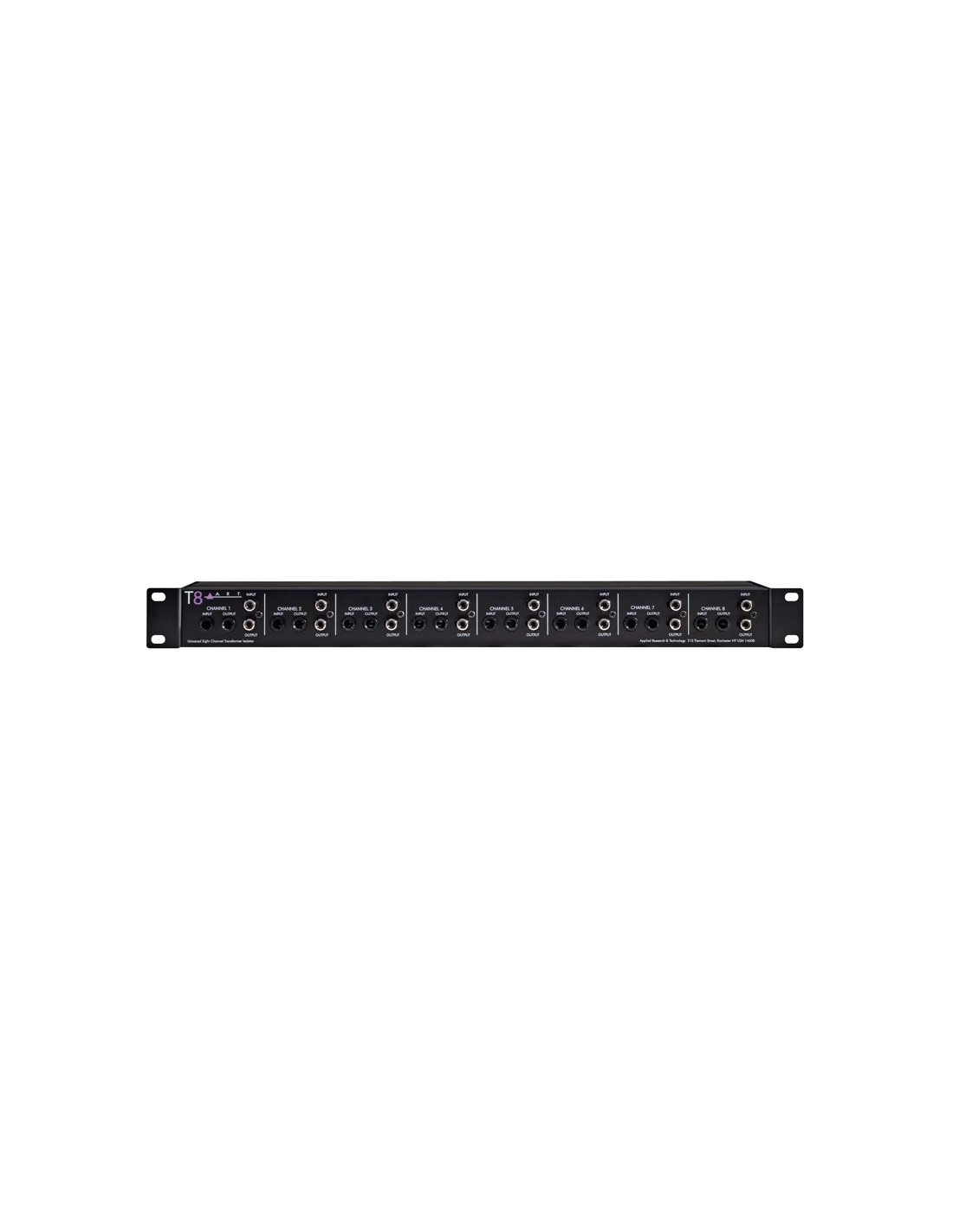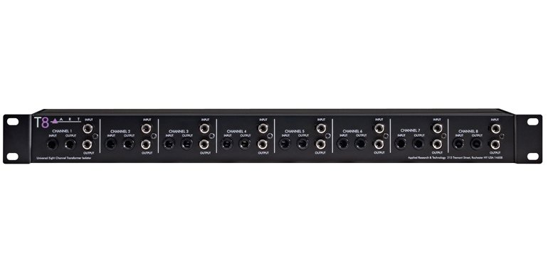 TRANSFORMATOR/ISOLATOR MIT 8 KANÄLEN Der T8 (Transformer Eight) ist ein hochwertiges, vollständig passives Audio-Interface, das acht diskrete Transformatoren verwendet, um die Massen der Eingangs- und Ausgangssignale zu trennen, wodurch zwei Systeme isoliert werden, um Brumm und Rauschen von Massekreisen zu reduzieren. Die Audio-Transformatoren des T8 haben eine extrem flache und breite Frequenzantwort und sind in der Lage, Hochpegel-Signale zu verarbeiten, während sie eine vollständig isolierte symmetrische Verbindung aufrechterhalten. Dies verleiht dem T8 einen sehr sauberen und neutralen Klang mit einer großen Vielfalt an Signalquellen. Die Transformatoren sind für einen Einheit-Gewinn von 1:1 ausgelegt und können mit Impedanzen von 600 Ohm bis 100 kOhm verwendet werden. Der T8 bietet gleichzeitig symmetrische XLR- und 1/4"-TRS-Klinkenanschlüsse sowie RCA an allen Eingängen und Ausgängen. Die Rack-Montagewinkel sind umkehrbar, sodass der T8 entweder die XLR- oder die 1/4"-Klinken- und RCA-Anschlüsse an der Vorderseite haben kann, was die Flexibilität bei der Verkabelung des Systems maximiert. Das vollständige Funktionsset, die robuste Bauweise und die hochwertigen Spezifikationen machen den T8 zur offensichtlichen Wahl für Live-Anwendungen, feste Installationen, D.J.s und jede P.A.-Anwendung.