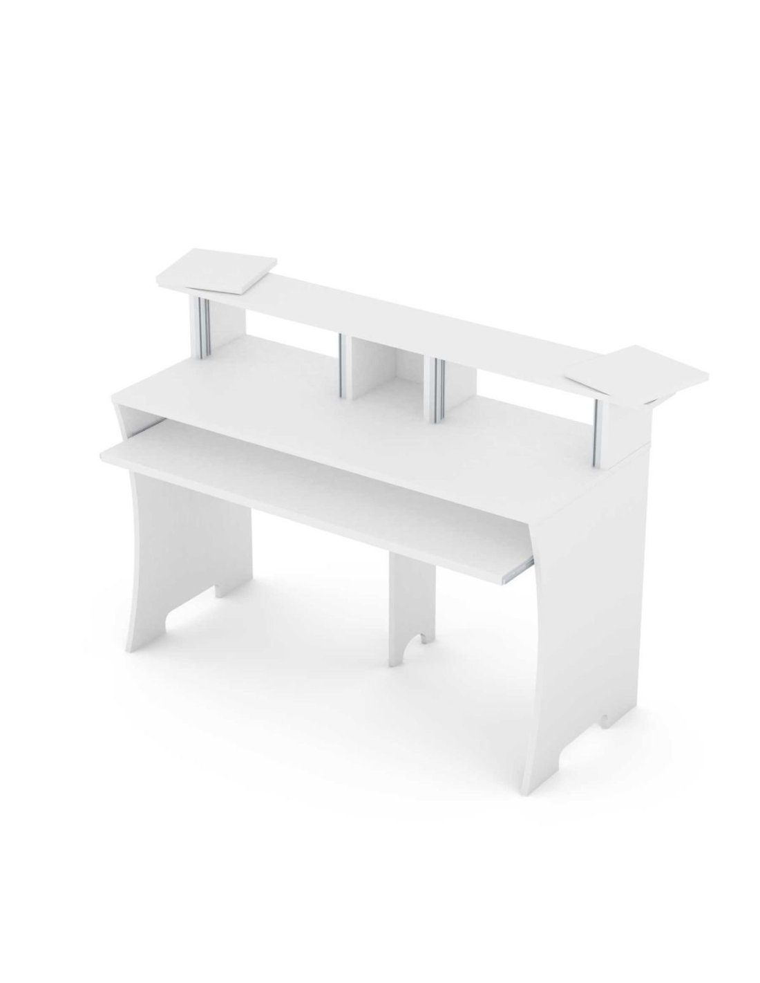 GLORIOUS WORKBENCH WEISS. Arbeitstisch für Home- und Projektstudios ausgestattet mit einem herausziehbaren Fach für Masterkeyboard, Tastatur, Mixer usw., drehbaren Monitorhaltern für 4U Rack 19", erhöhtem Tisch für ein oder zwei Videomonitore. Hergestellt aus Holz. Farbgebung weiß.