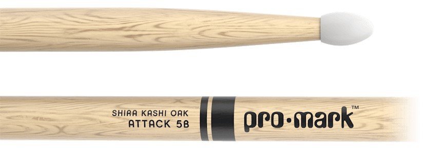 PRO MARK ATTACK 5B NYLON TIP PW5BN. Bacchetta 5b aus japanischem Eichenholz Shira Kashi mit ovaler Nylonspitze, vergrößertem Durchmesser und mittlerer Verjüngung für eine gut ausgewogene Ansprache und einen ausgewogenen Rückprall.