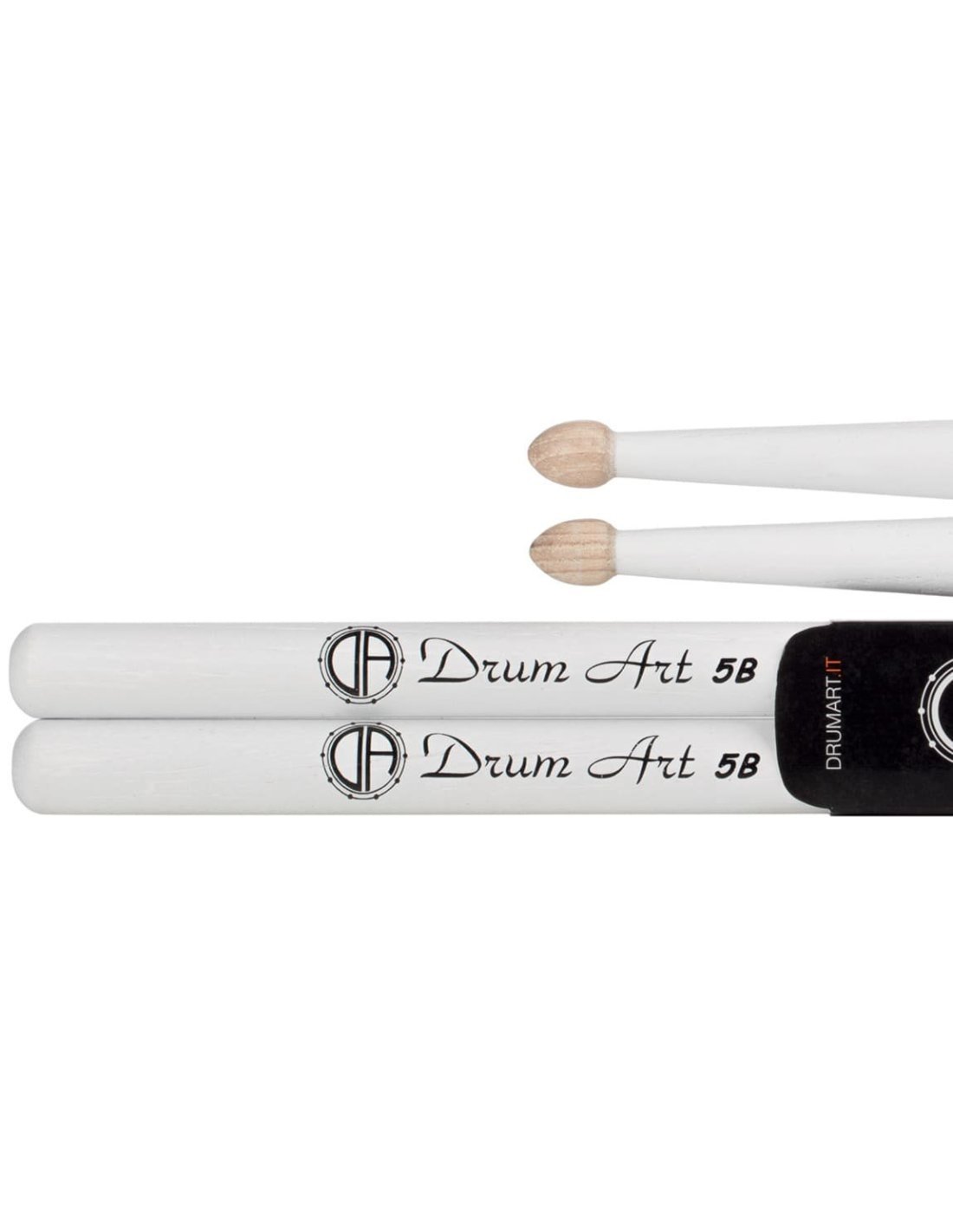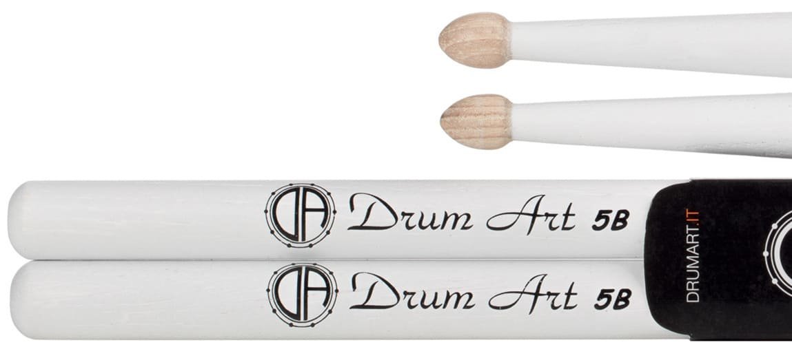 DRUM ART 5B WEISS. Paar von 5b Drumsticks aus amerikanischem Nussbaum mit robustem Körper für eine kraftvolle und gut ausbalancierte Ansprache, mit Eichelspitze für mehr Präsenz auf den Becken und einer weißen, schweißresistenten Lackierung.