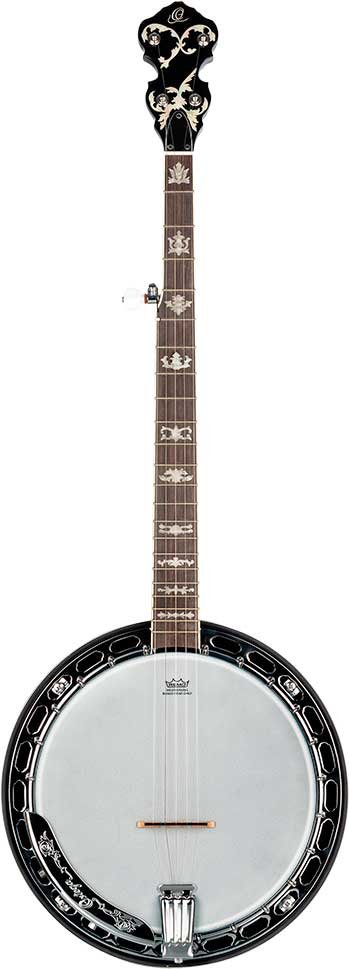 Professionelles 5-saitiges Banjo, mit Korpus aus geflammtem Ahorn, Hals aus Stahl und natürlicher satinierter Oberfläche. Inklusive Tasche