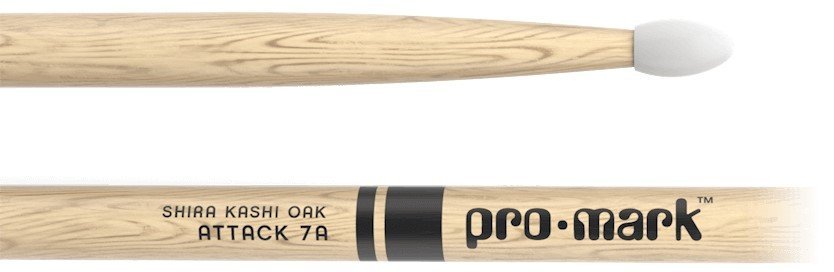 PRO MARK ATTACK 7A NYLON TIP PW7AN. 7A-Stick aus japanischem Eichenholz Shira Kashi mit ovaler Nylonspitze, Standarddurchmesser für diejenigen, die einen leichten und kurzen Stick lieben. Ausgezeichnet für Jazz und wo niedrigere Lautstärken geschätzt werden.