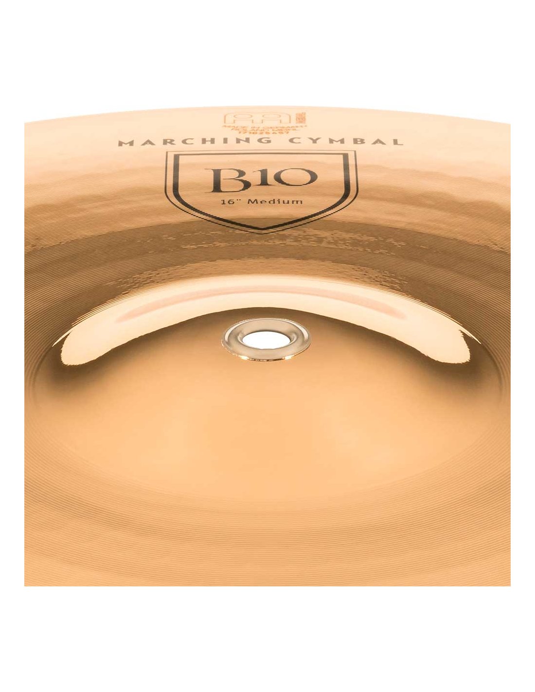'Professionelle Crash-Becken der Serie B10 MA-B10-16M mit einem mittleren Gewicht von 16''. Die Marschbecken der Serie B10 werden mechanisch in Deutschland aus B10-Legierung hergestellt. Sie werden geformt, dann aufeinander abgestimmt und kalibriert.