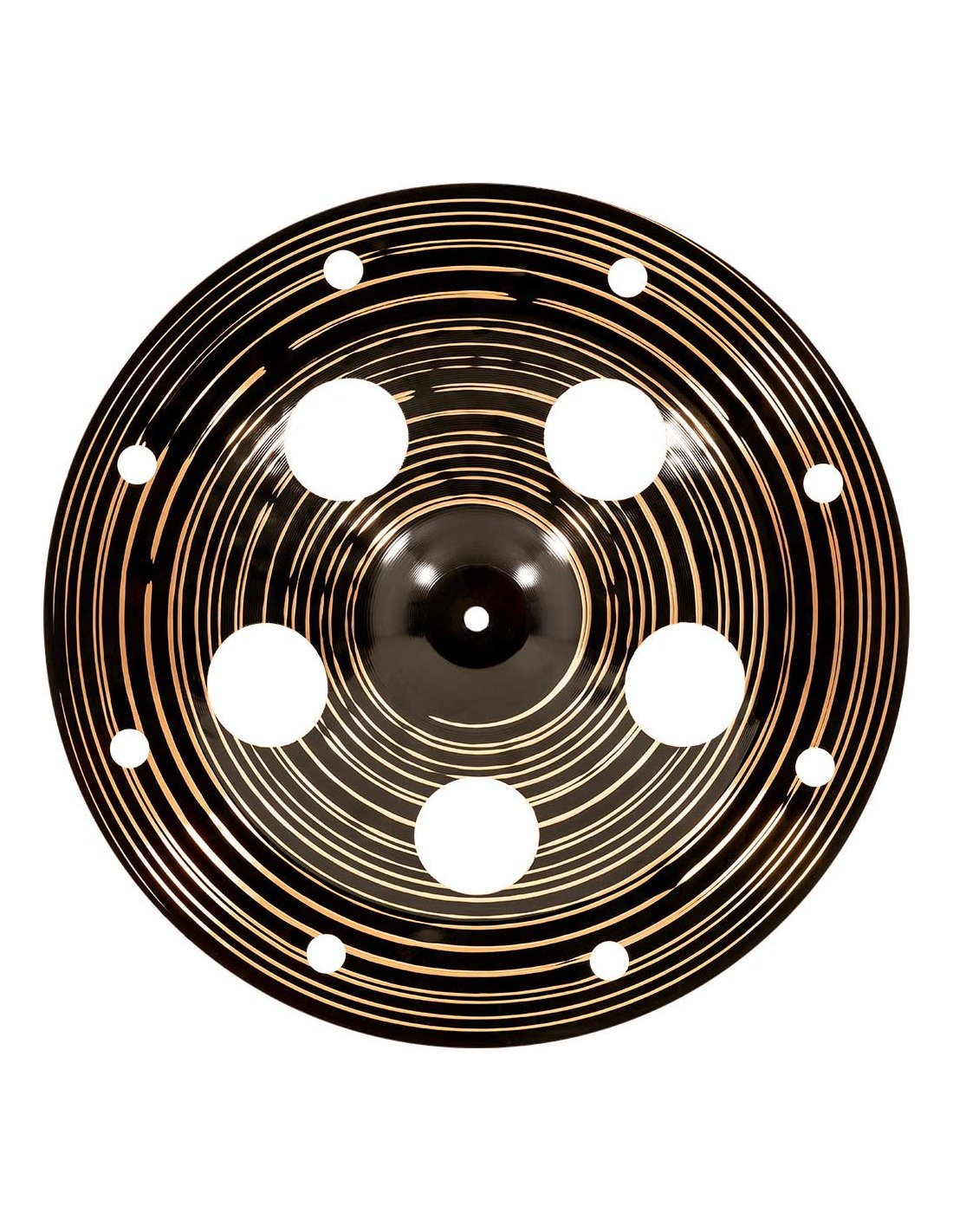 Trash China 18'' Serie Classics Custom Dark. Die Platten der Serie Classics Custom Dark werden mechanisch in Deutschland aus einer B10-Legierung hergestellt. Der Prozess umfasst verschiedene Techniken, sowohl Pressen als auch computergestütztes Hämmern. Darüber hinaus haben sie eine glänzende schwarze Oberfläche, die ihnen ein spektakuläres Aussehen und einen besonderen Klang verleiht.