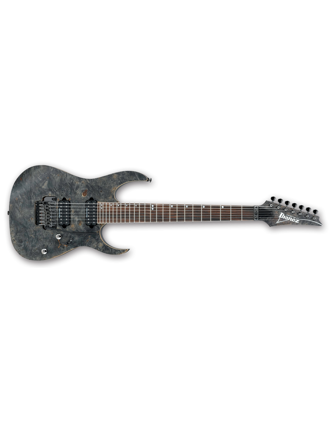 Chitarra Elettrica Ibanez RG927WBBZ-TGF colore TRANSPARENT GRAY FLAT. L'Ibanez RG927WBBZ-TGF è una chitarra elettrica a 7 corde. Le caratteristiche tecniche includono corpo in tiglio con top in buckeye burl, manico Wizard-7 5pc in bubinga e wengè, tastiera in palissandro, radius 400mm, 24 tasti jumbo, ponte Edge-Zero II-7 tremolo w/ZPS3Fe, pickup DiMarzio IBZ-7 (neck/bridge).