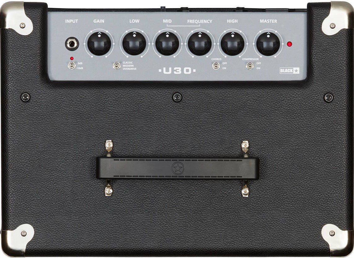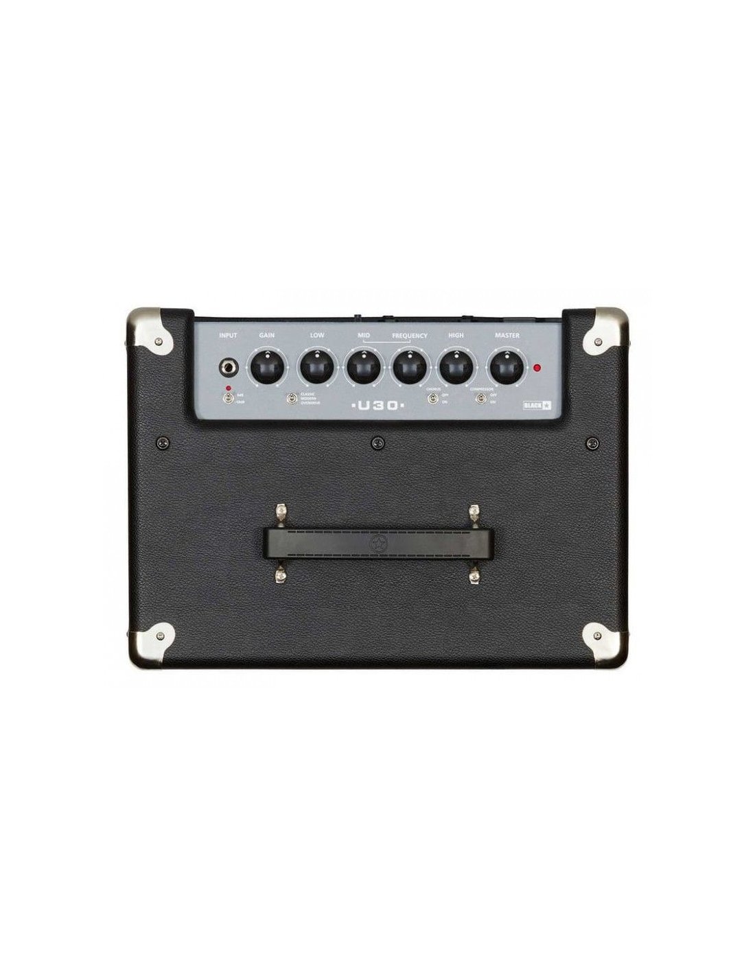 BLACKSTAR UNITY U-30. Combo-Verstärker für Bass mit 30W 1x8". Die technischen Merkmale umfassen einen einzelnen 8" Blackstar Custom Lautsprecher, einen 3-Band-EQ mit parametrischer Mittenregelung, Gain- und Master-Regler, 3 wählbare Vorstufen über einen Schalter (Classic, Modern, Overdrive), aktivierbare Chorus- und Kompressor-Effekte über dedizierte Schalter, Pad 0/-10Db. Es verfügt über einen Line Out-Ausgang über XLR und Klinke mit Ground Lift-Taste, CabLink-Ausgang über XLR, Mp3 Line In über 3,5mm TRS-Klinke, Fußschalter-Eingang.