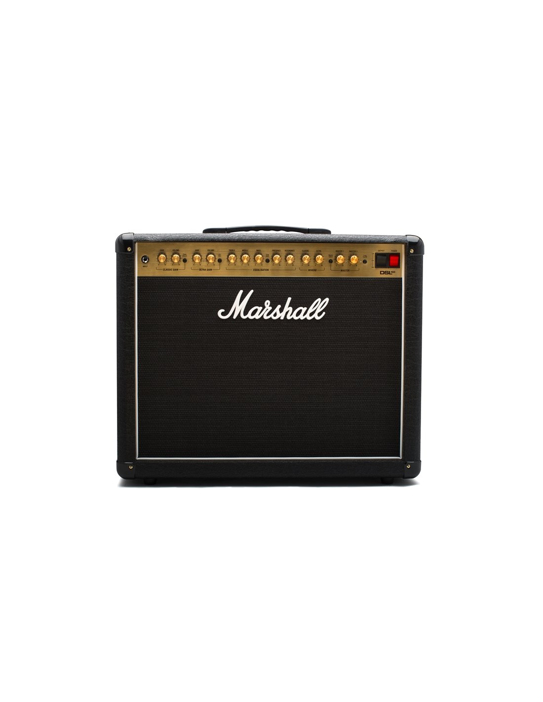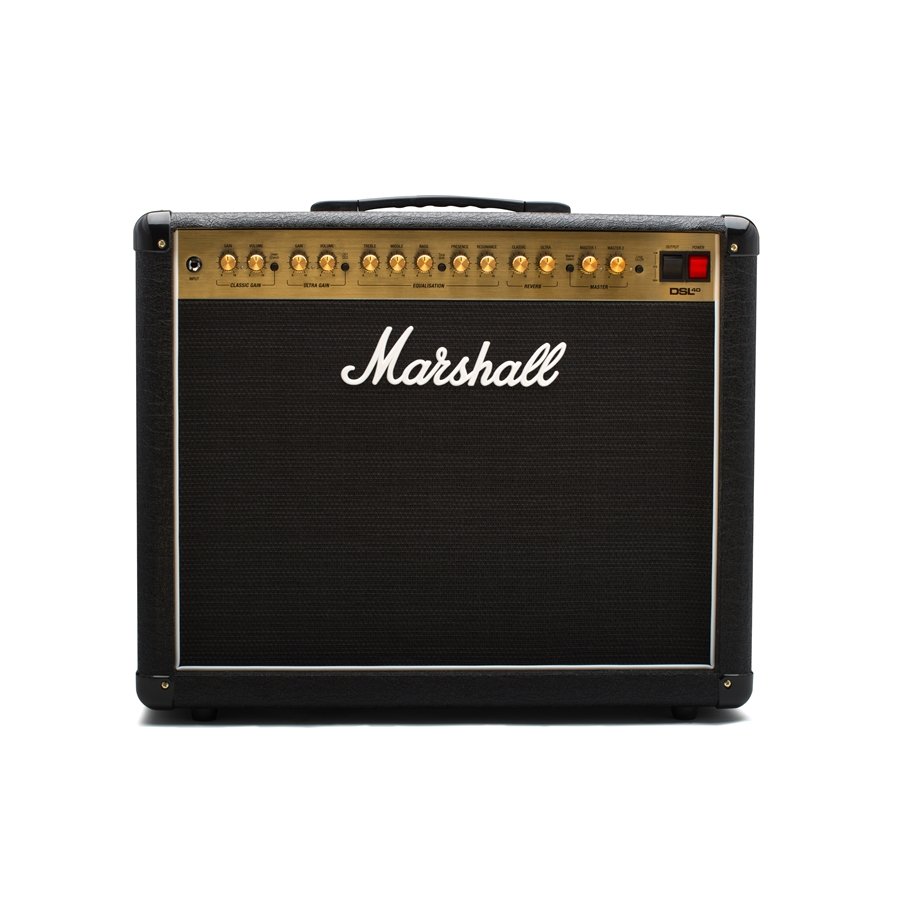 Gitarrenverstärker Marshall DSL40CR Combo 40W. Der Marshall DSL40CR Combo 40W ist ein 40-Watt-Röhrenverstärker für E-Gitarre mit 4 ECC83-Röhren, 2 EL34-Röhren, 2 Kanälen (Classic Gain/Ultra Gain), Reglern (Classic Gain Ch.) Gain, Lautstärke, Clean/Crunch-Schalter, (Ultra Gain Ch.) Gain, Lautstärke, Od1/Od2-Schalter, Lautstärke, Höhen, Mitten, Bässe, Tone Shift-Schalter, Presence, Resonanz, Reverb (Classic und Ultra), Master Select-Schalter, Master 1, Master 2, Loop On/Off-Schalter, FX Loop, Audio In, Emulated Out, High/Low Output (40W/20W), 1 Lautsprecher 12" Celestion V-Type.
