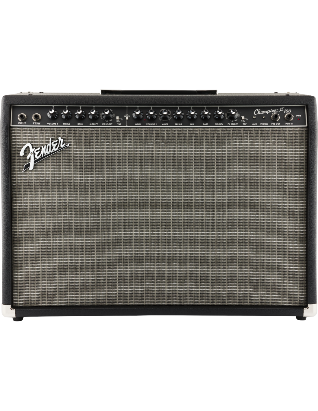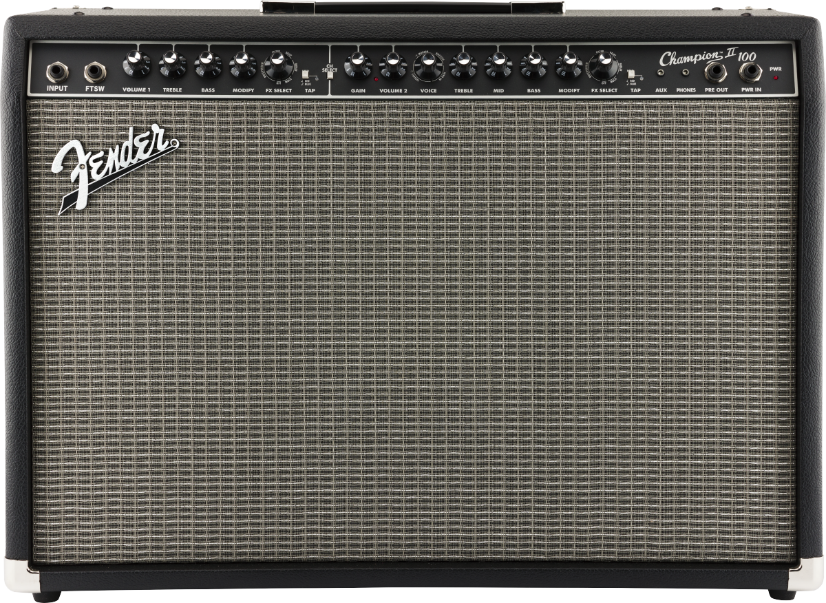 FENDER CHAMPION 100 II ist ein digitaler Combo-Verstärker 2X12" für Gitarre mit 2 Kanälen, integrierten digitalen Effekten und 100W Leistung bei 8 Ohm. Die technischen Merkmale umfassen 2 Lautsprecher von 12" Fender Special Design, 2 wählbare Kanäle über einen speziellen Knopf oder Fußschalter: Kanal 1 beinhaltet die Regler für Lautstärke, 2-Band-Equalizer Höhen/Bässe, FX-Level, FX-Auswahl und TAP-Tempo. Kanal 2 beinhaltet die Regler für Gain, Lautstärke, 3-Band-Equalizer Höhen/Mitten/Bässe, einen Voice-Regler, der die Auswahl von 4 verschiedenen Verstärkern ermöglicht, FX-Level, FX-Auswahl und TAP-Tempo. Es bietet außerdem eine Auswahl an integrierten Effekten, darunter Hall, Delay/Echo, Chorus, Tremolo, Vibratone und andere, AUX- und Kopfhörereingang über 3,5mm Klinke, USB-Anschluss auf der Rückseite für Firmware-Updates, Effekt-Loop (Preamp Out, Power Amp In) zur Verwendung mit externen Effekten. Enthält einen 2-Tasten-Fußschalter.
