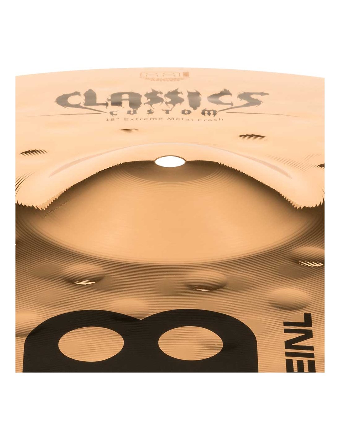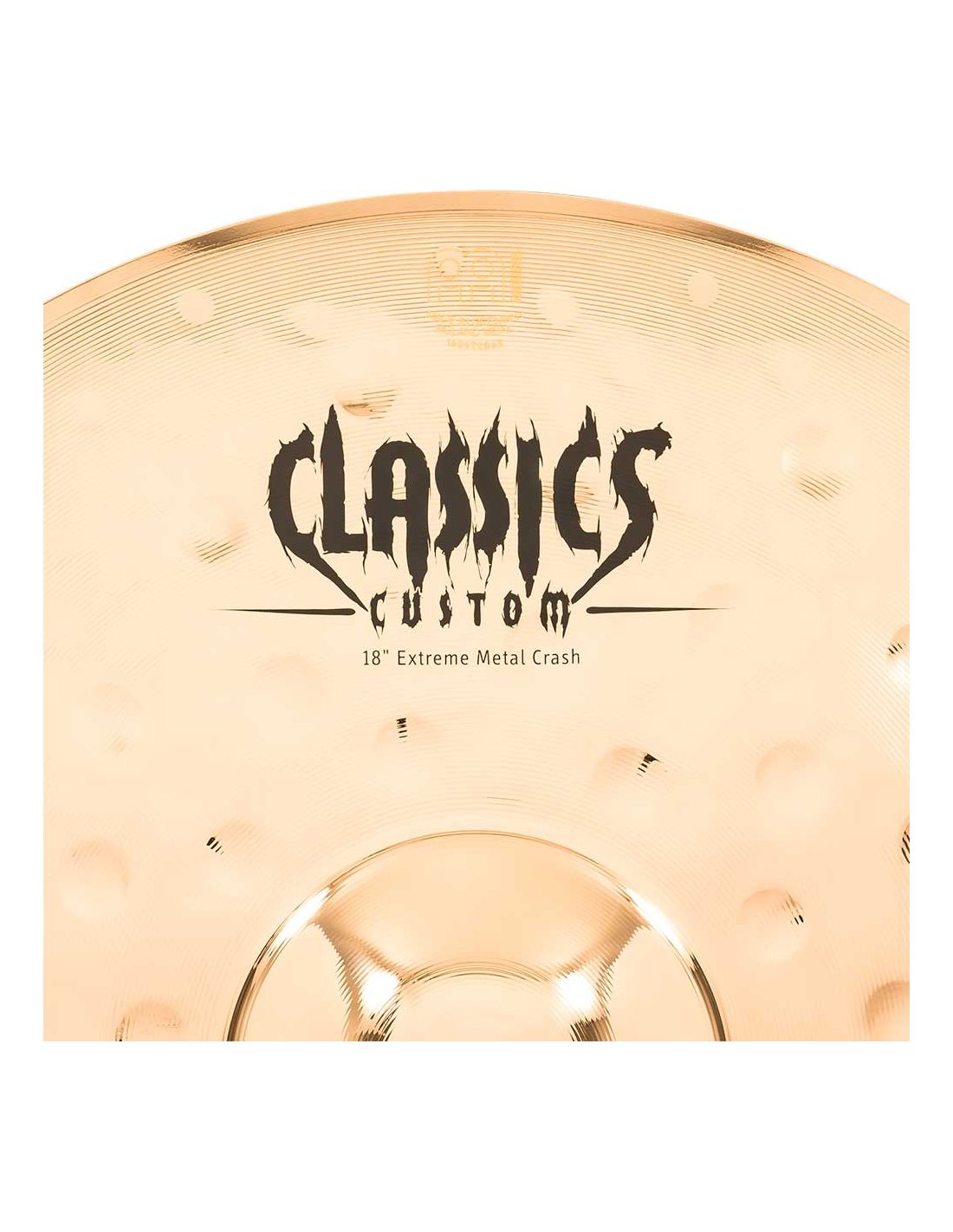 'Crash 18'', Serie Classics Custom Extreme Metal. Die Becken der Serie Classics Custom Extreme Metal werden mechanisch in Deutschland aus einer B10-Legierung hergestellt und haben ein leicht höheres Gewicht als die Classics Custom, was ihnen eine wirklich große Power verleiht. Der Prozess umfasst verschiedene Techniken, sowohl Pressen als auch computergestütztes Hämmern. Darüber hinaus erhalten sie eine glänzende Lackierung, die ihnen ein spektakuläres, glänzendes Finish verleiht.