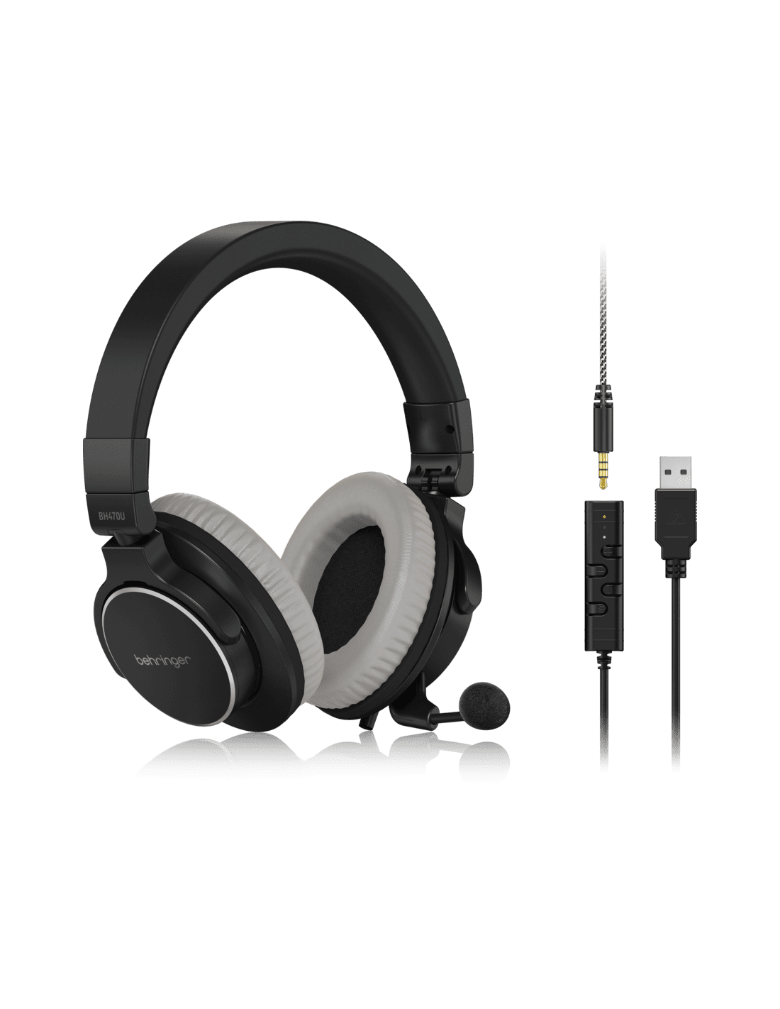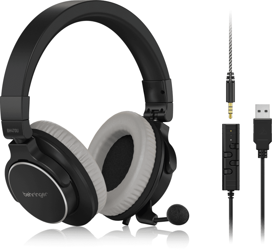 BEHRINGER BH 470U. Geschlossene Stereo-Kopfhörer mit Bügelmikrofon. Die technischen Merkmale umfassen 40 mm Neodym-Treiber, ein Bügelmikrofon mit Geräuschunterdrückung, abnehmbares Steuerinterface, USB-Kabel, 2,5 m Kabel mit 3,5 mm Klinkenstecker. Enthält Windschutz für das Mikrofon