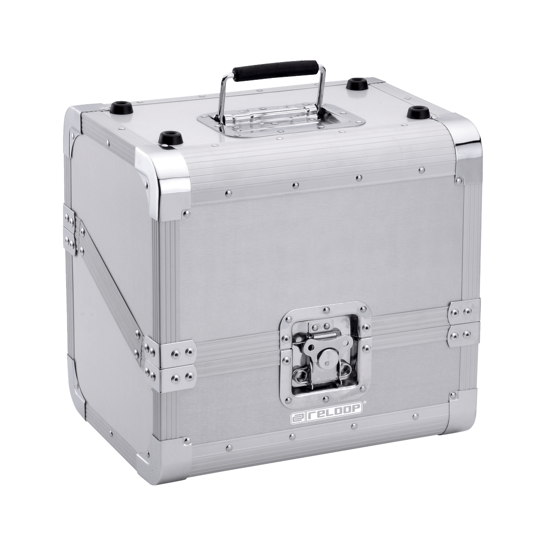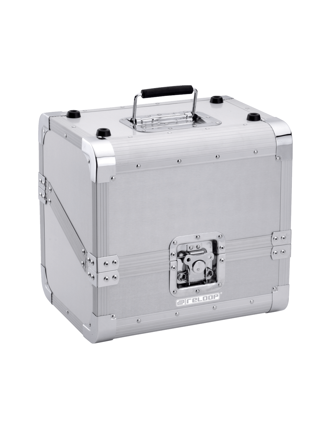 RELOOP 80 RECORD CASE SILVER. Vinyl-Transportkoffer aus mit Aluminium beschichtetem Sperrholz, der bis zu 80 Schallplatten in 2 Innenfächern aufnehmen kann. Ausgestattet mit einem Griff, Butterfly-Verschlüssen mit Schlüssel, Innenpolsterung und abnehmbarem Deckel.