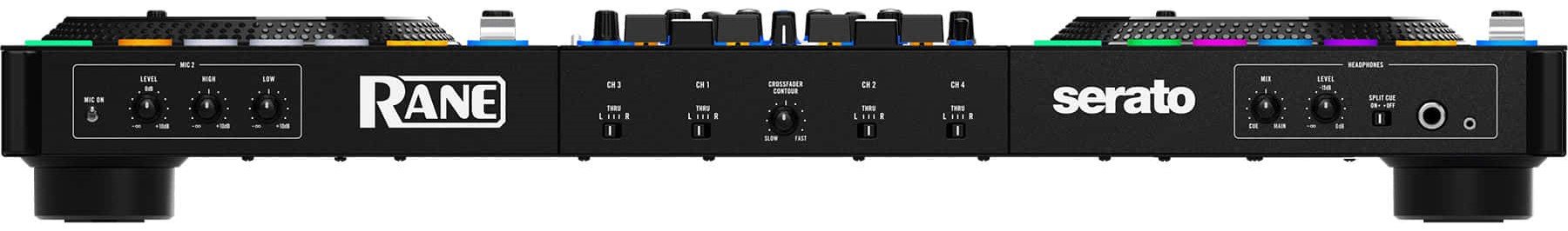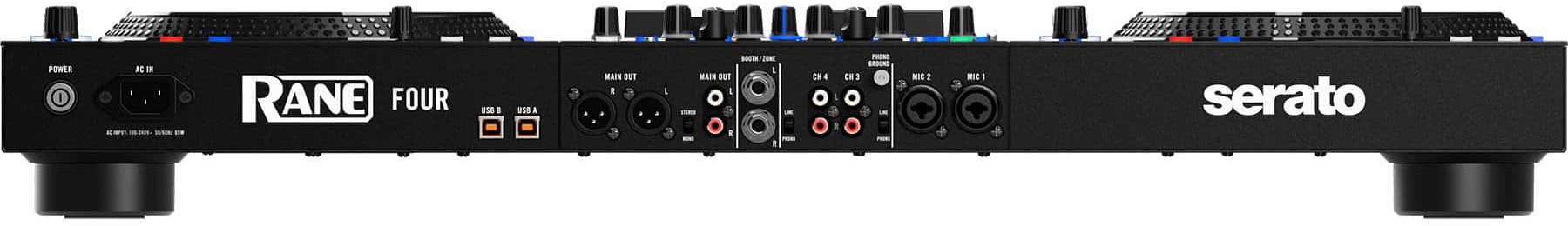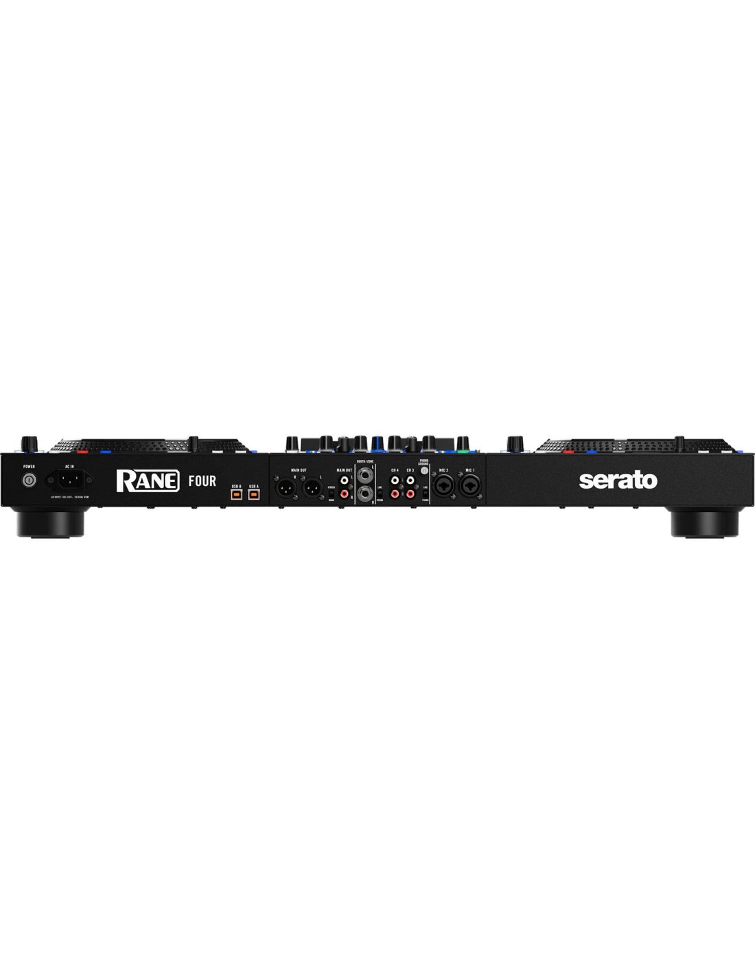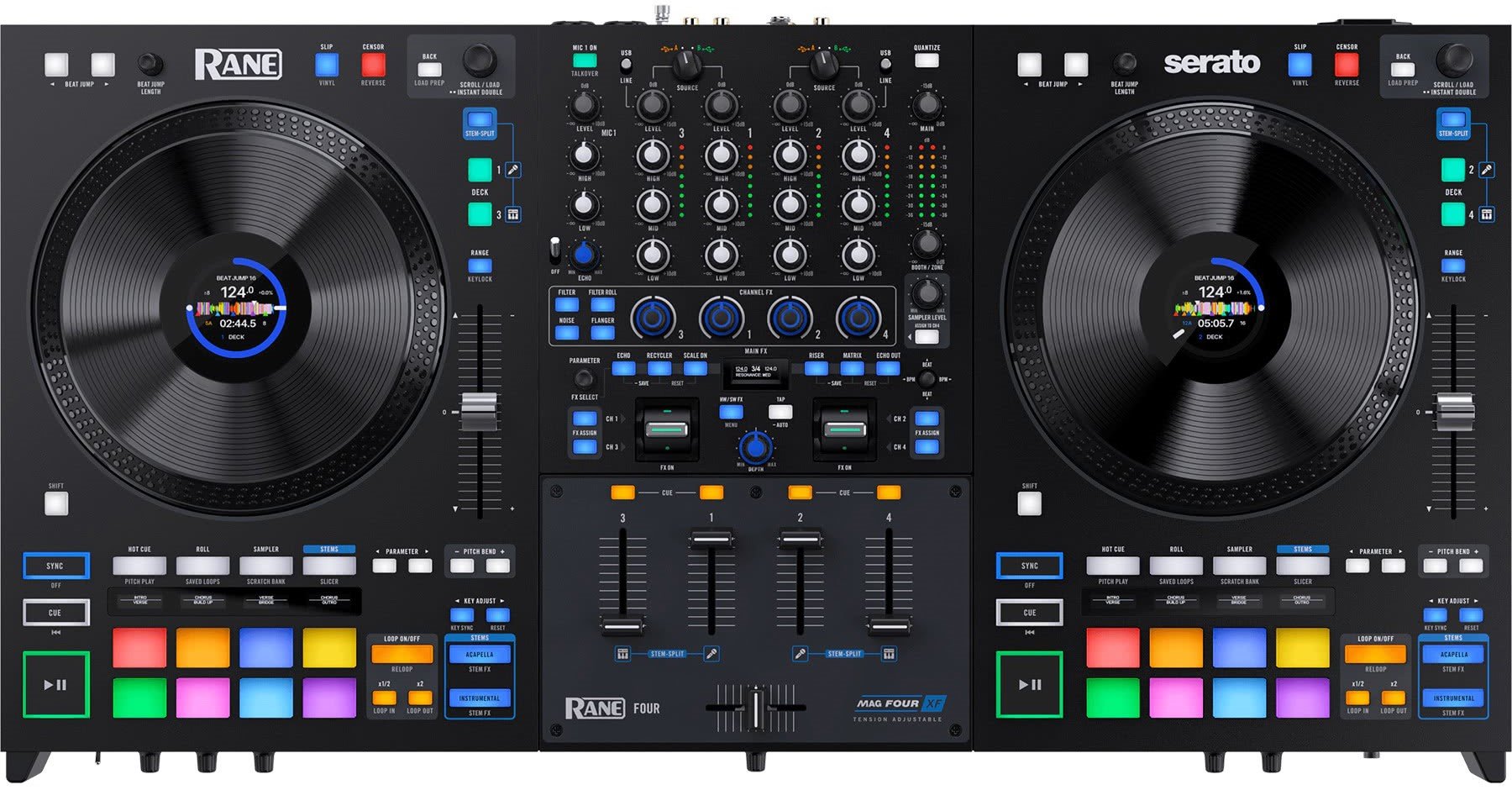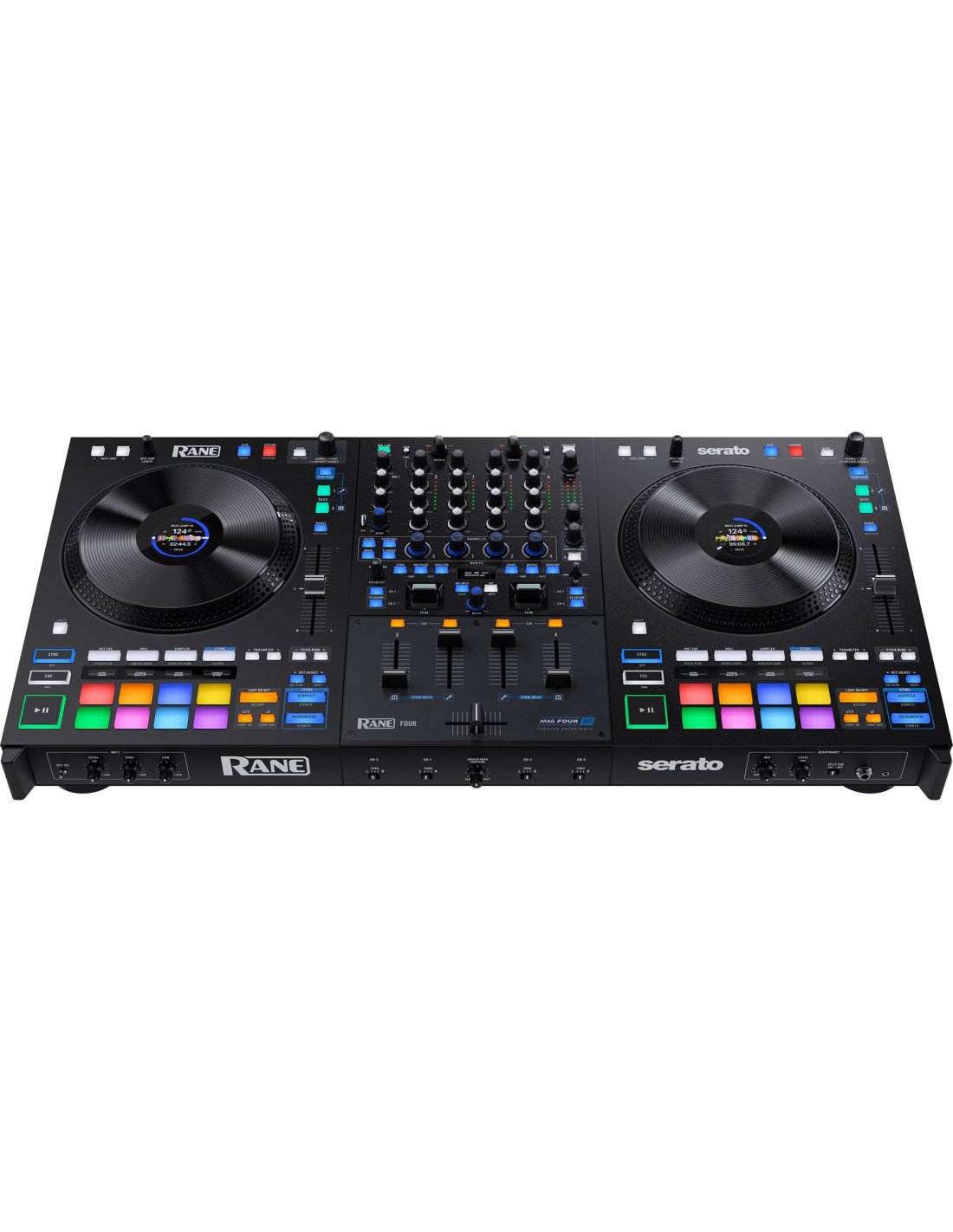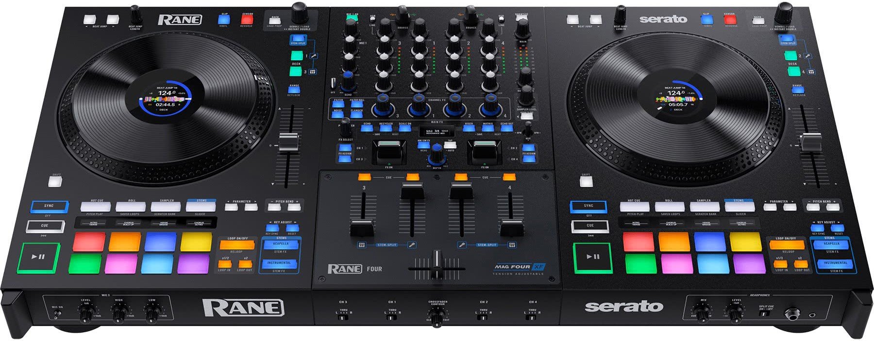 RANE FOUR. Professioneller DJ-Controller mit 4 Decks, steuerbar und integrierbar mit der App Serato DJ. Die technischen Merkmale umfassen den Pad-Stems-Modus von Serato, 8 OLED-Displays über den 16 Performance-Pads für visuelles Feedback in allen Pad-Modi: Cue, Loop, Namen der Samples, Längen von Roll und Loop, Beat-Teilungen, Pitch Play, Stem-Elemente und FX, 2 reaktive Jog-Wheels mit 8,5" und zentralem LCD-Display. Außerdem bietet er 22 Haupt-FX-Hardware, 4 Channel-FX, die über Regler gesteuert werden, wie Reverb, Scale Down Echo, Recycler, Riser, Filter, Filter Roll, Noise, Flanger. Ausgestattet mit einem 4-Kanal-Mixer mit vollständiger EQ-Kontrolle, intuitiver FX-Zuweisung, verbessertem Sampler-Routing und Schnellzugriffstasten für die Deck-Jog-Wheels.