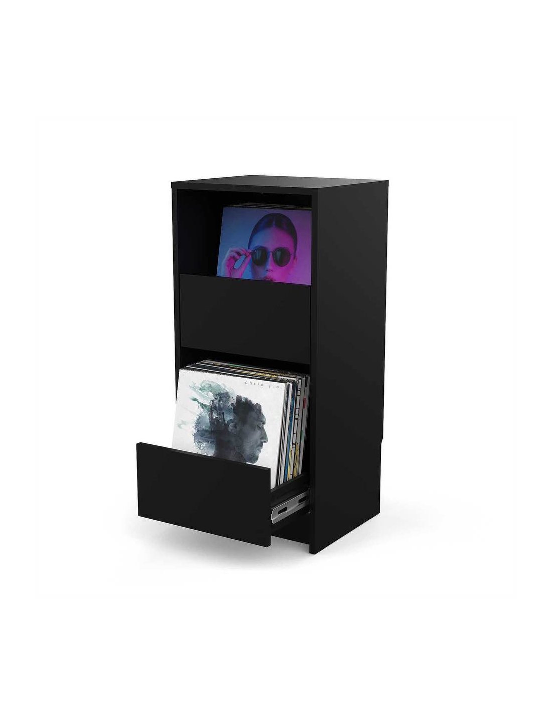 Raccoglitore für die Aufnahme von bis zu 2 x 80 Vinyls von 12”, hergestellt aus MDF, ausgestattet mit 2 Schubladen, modulares Design zur Kombination mit weiteren Vinyl Vault-Einheiten, Abmessungen mm 406(B) x 856(H) x 342(T), Gewicht 17,9 kg, Farbe schwarz.