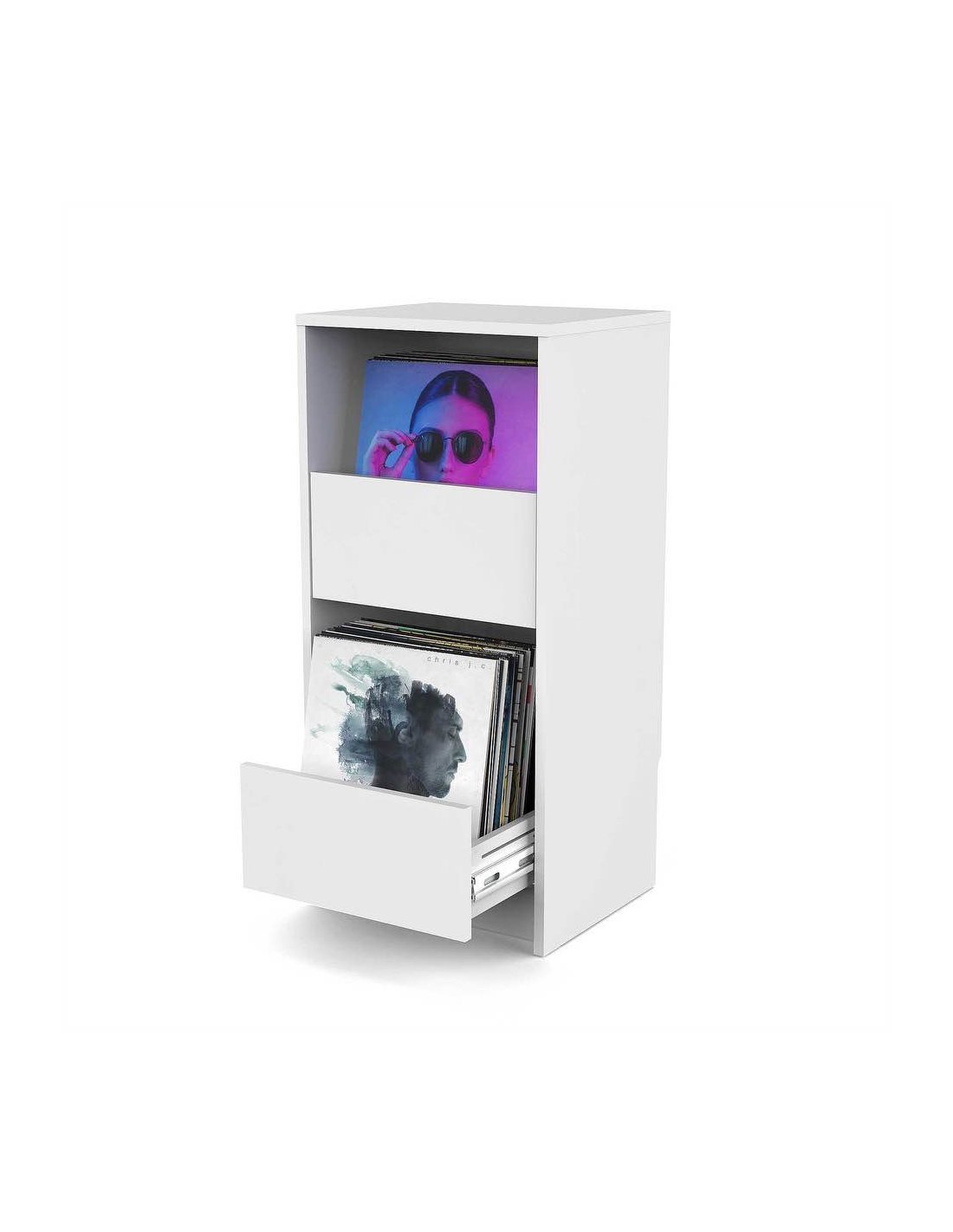 Raccoglitore für die Aufbewahrung von bis zu 2 x 80 Vinyls von 12”, aus MDF gefertigt, ausgestattet mit 2 Schubladen, modulares Design zur Kombination mit weiteren Vinyl Vault-Einheiten, Abmessungen mm 406(B) x 856(H) x 342(T), Gewicht 17,9 kg, Farbe weiß.