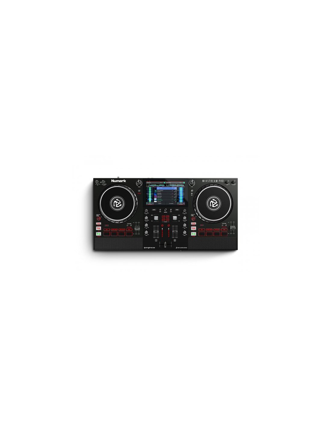 NUMARK MIXSTREAM PRO è un controller a 2 deck per Dj con funzionalità WIFI, speaker integrati touchscreen da 7". Le caratteristiche tecniche includono 2 Jog Wheel touch sensitive da 6", effetti di luce integrati Philips Hue Smart Lighting, controllo DMX, interfaccia audio integrata a 24bit, 4 effetti selezionabili con trigger a doppio paddle, 2 channel strip con eq a 3 bande, controllo level, faders e crossfader, 4 performance pad su ogni deck. Dotato di ingresso microfonico TRS con controllo livello, uscita main tramite XLR, uscita RCA e uscita cuffie, 2 porte USB, slot per scheda SD.