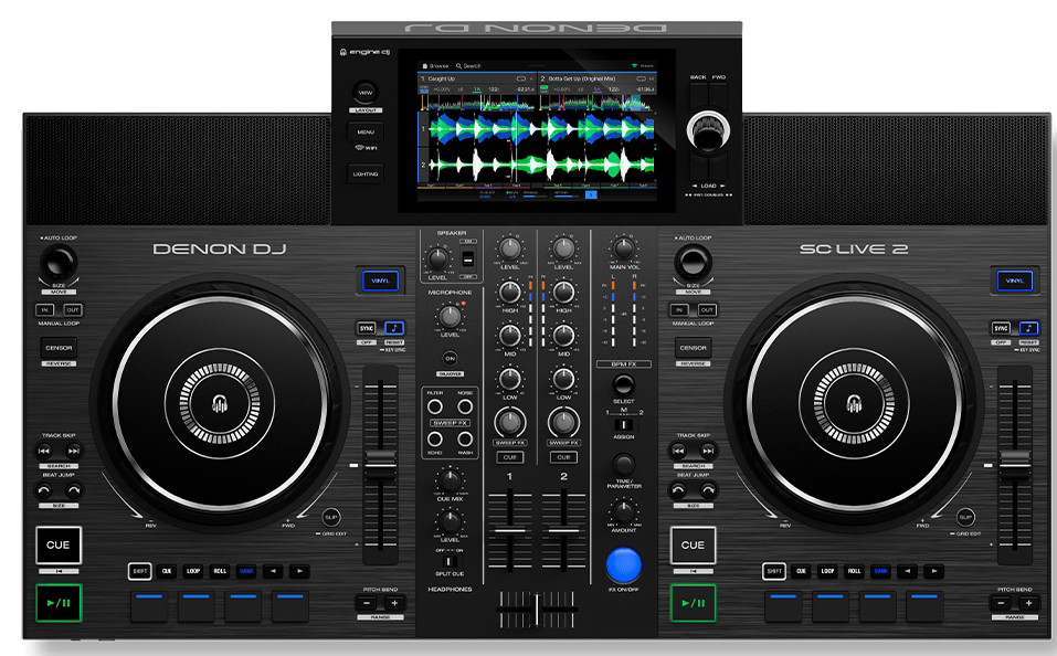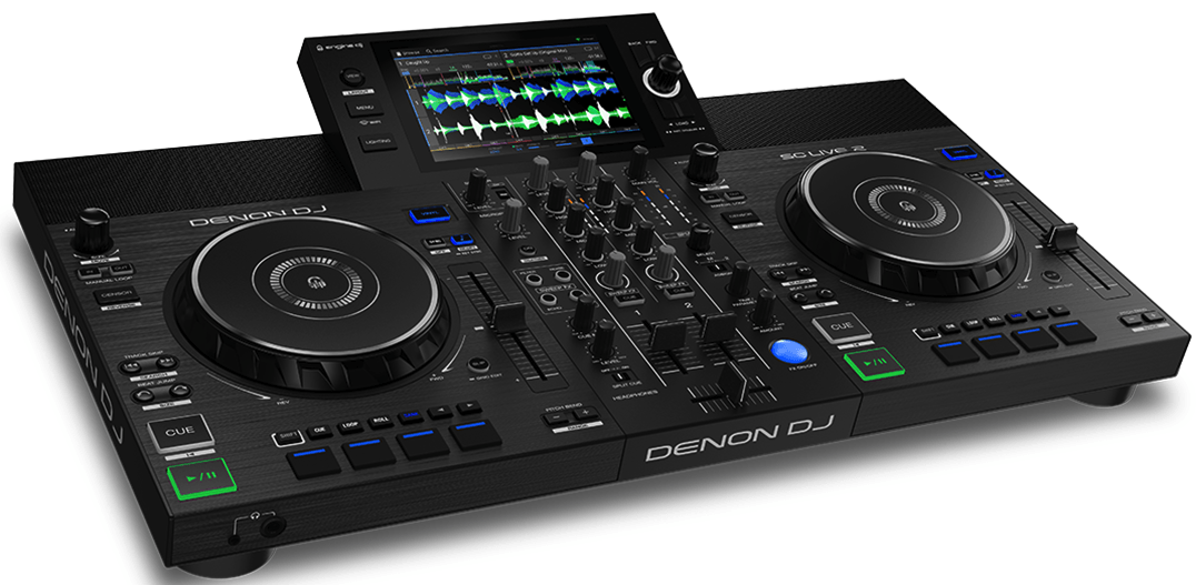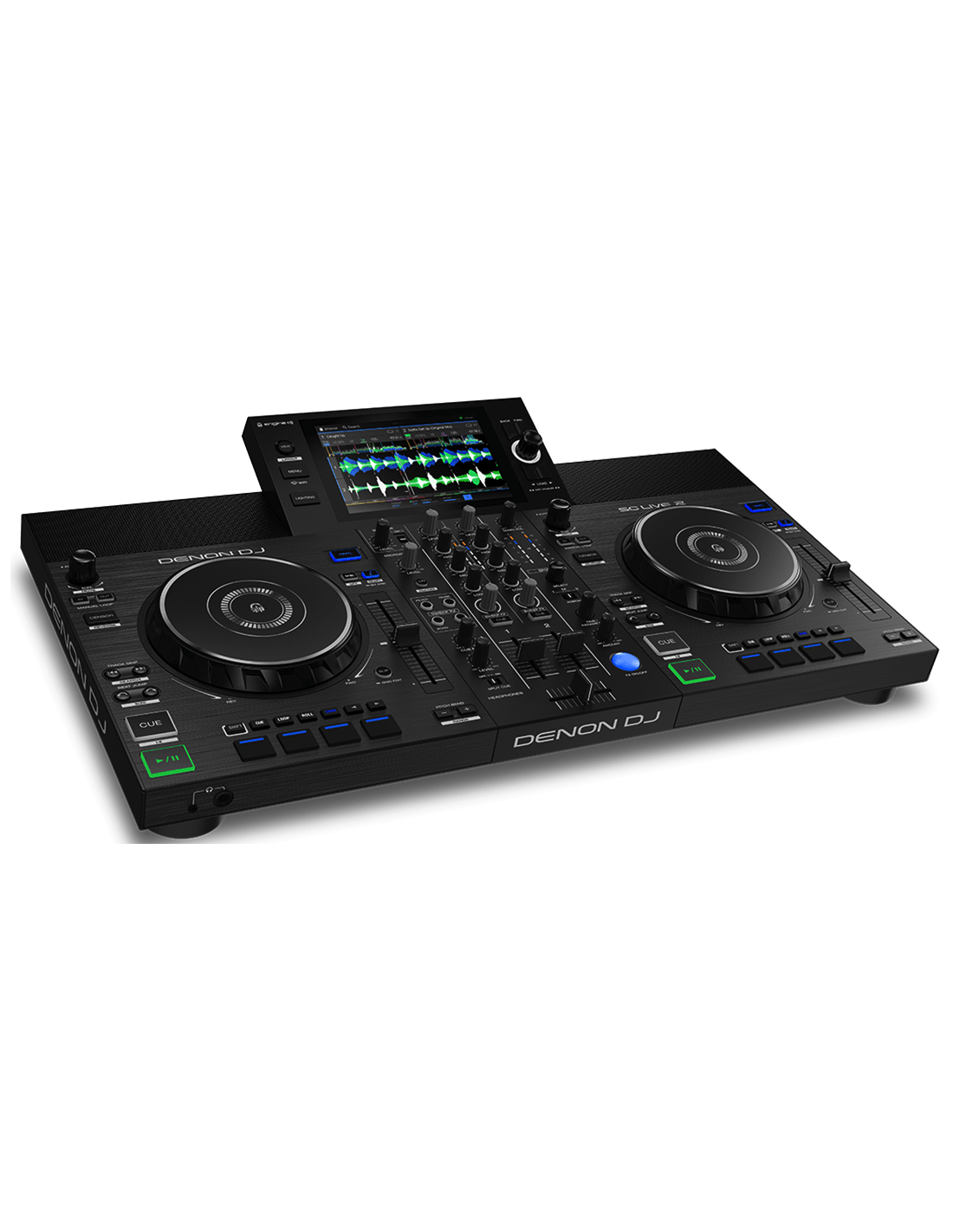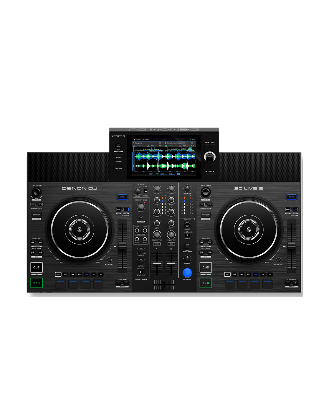 DENON DJ SC LIVE2 ist ein Standalone DJ-Controller mit 2 Decks, einem 7" Multi-Touch-Display, Wi-Fi-Streaming und Amazon Music-Integration. Die technischen Merkmale umfassen eine Standalone Engine DJ OS für den Einsatz ohne Computer, ein 7" HD Touch Multi-Touch-Display für eine flüssige Navigation, Vorschau von Wellenformen, Suche, Filter und Bibliotheksverwaltung, 2 Kanäle mit integriertem Mixer und 3-Band-Equalizer, Tiefpass-/Hochpassfilter, unabhängige VU-Meter und Gain, integriertes Wi-Fi-Streaming für den Zugriff auf Amazon Music Unlimited, TIDAL, Beatport LINK, SoundCloud GO+, Dropbox und andere, 8 RGB Performance Pads pro Deck mit Cue-, Loop-, Roll-, Slicer- und kreativen Modi, integrierte Lautsprecher, Multi-Band FX-Effekte und Touch FX, 24-Bit / 44,1 kHz Audio-Interface, 2 berührungsempfindliche Jog Wheels mit 6". Es bietet einen balancierten Master-XLR-Ausgang + RCA, einen balancierten Booth-TRS-Ausgang, einen Mikrofoneingang (Combo Jack/XLR) mit Lautstärkeregler, 2 Kopfhörerausgänge (1/4” und 1/8”), 2 USB-A-Anschlüsse + 1 USB-B-Anschluss für die Verbindung mit einem externen Computer + 1 SD-Kartenanschluss, eine Schnittstelle zur Synchronisierung und Steuerung einer Lichtshow über ein DMX-Controller oder mit Philips Hue- und Nanoleaf-Beleuchtungssystemen.