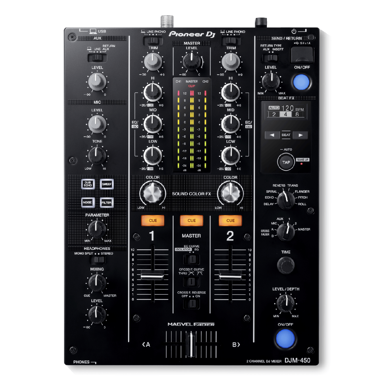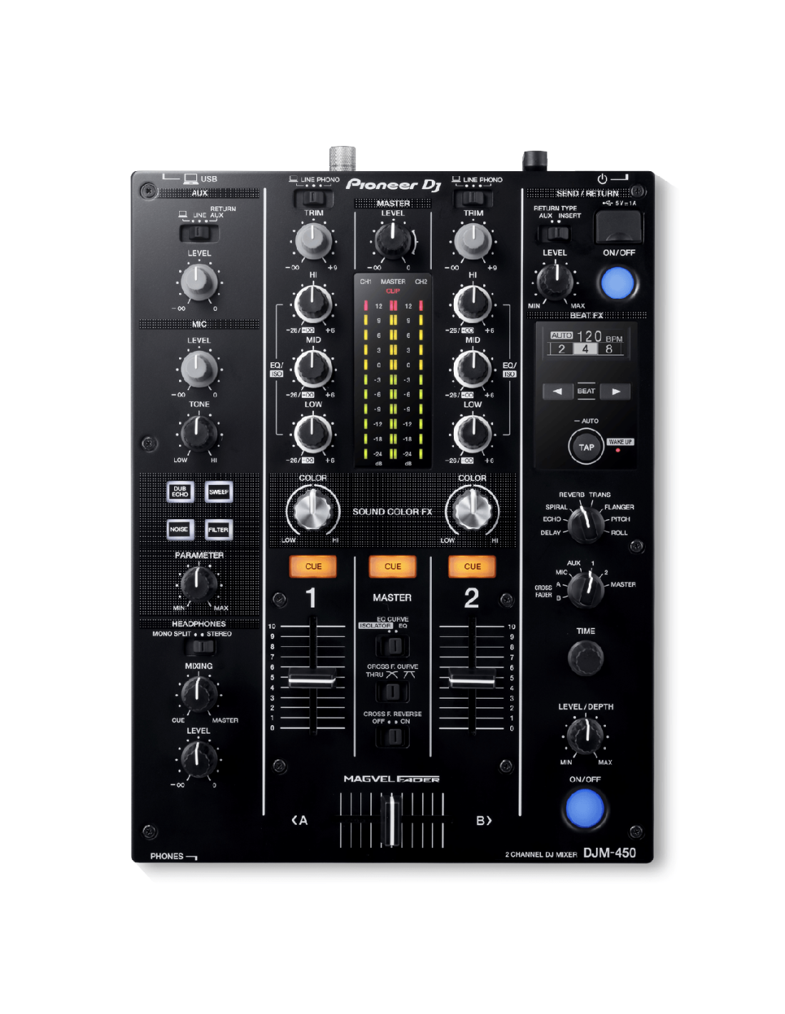 PIONEER DJ DJM450 ist ein digitaler 2-Kanal-Mixer für DJs mit einem 64-Bit-Mischprozessor. Zu den technischen Merkmalen gehören 2 Kanalzüge mit Fader zur Pegelregelung, ein 3-Band-Equalizer mit Colour-Regler, ein Crossfader, ein Eingangswahl-Schalter (digital, line, phono), 8 auswählbare Beat FX über einen Regler, eine integrierte Audio-Schnittstelle mit einer Abtastrate von 96 kHz / 24-Bit. Ausgestattet mit Line/Phono-Eingängen an jedem Kanal über RCA, Aux-In über RCA, Mic-Eingang über TRS, Master-Ausgang L/R über XLR.