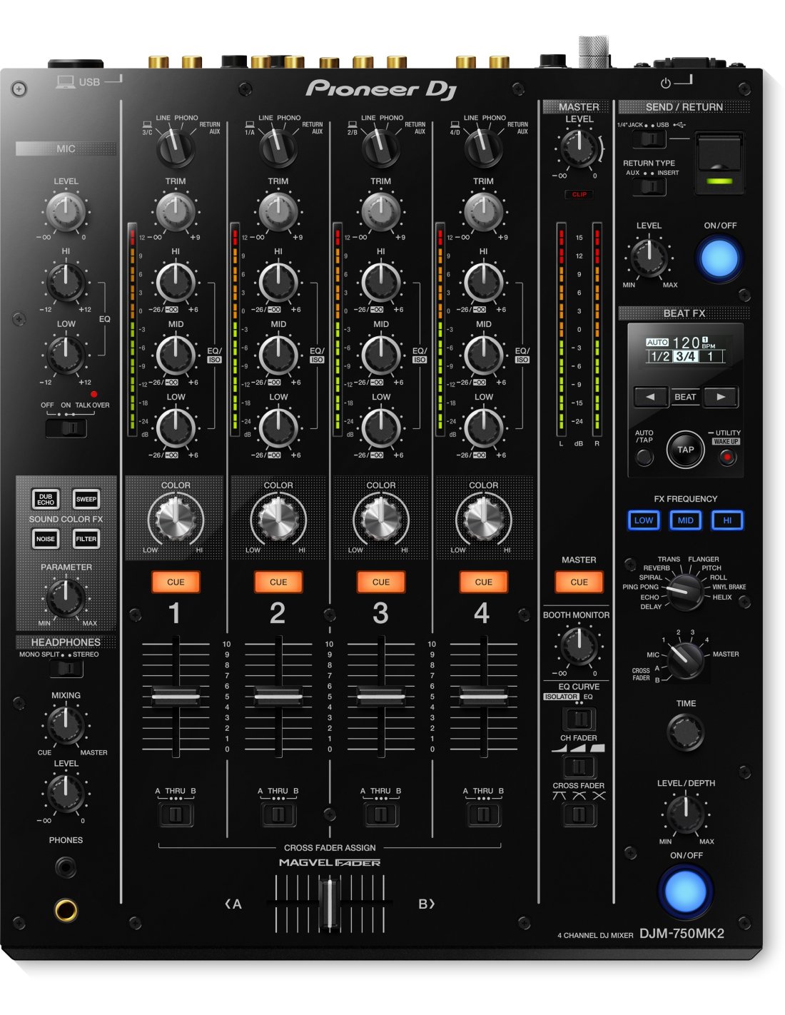 PIONEER DJM750MK2 ist ein digitaler 4-Kanal-Mixer für DJs mit einem 64-Bit-Mischprozessor. Die technischen Merkmale umfassen 4 Kanalzüge mit Fader zur Pegelsteuerung, einen 3-Band-Equalizer mit Colour-Control, Crossfader, Eingangswahlknopf (A, B, digital, line, phono, return, aux), 6 digitale Effekte (Sweep, Filter, Crush, Dub Echo, Noise und Space) auf jedem Kanal, 14 Beat FX, die über einen Regler auswählbar sind, integrierte Audio-Schnittstelle 4 In/5 Out mit einer Abtastrate von 96 kHz / 24-Bit. Ausgestattet mit einem Mikrofoneingang über XLR, Line/Phono-Eingängen auf jedem Kanal über RCA, Master-Ausgang L/R über XLR, separaten Send- und Return-Anschlüssen über TRS, LINK-Netzwerkanschluss, digitalen Ausgängen über RCA.