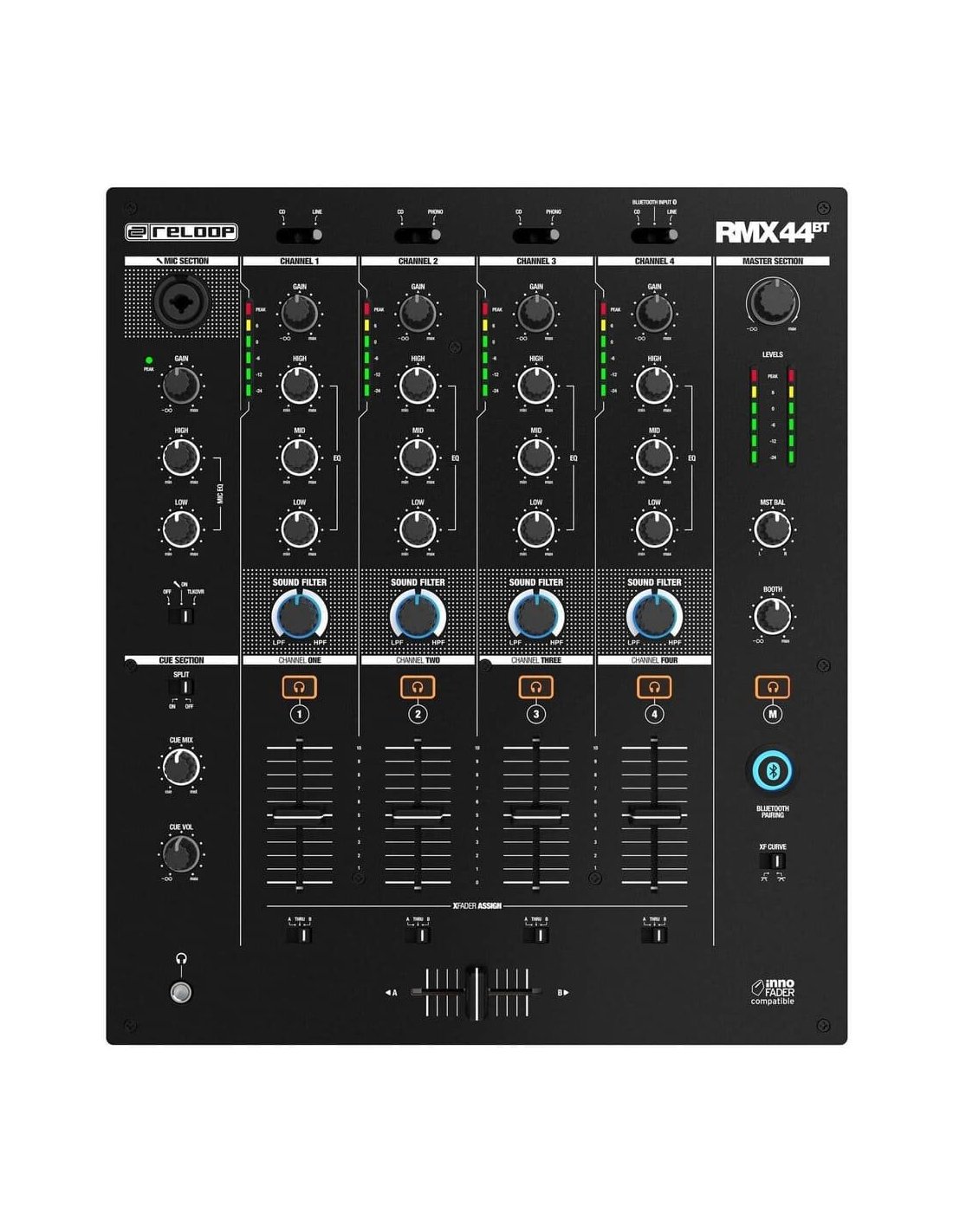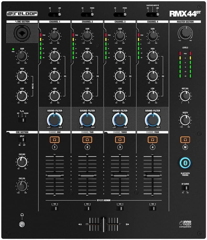 RELOOP RMX-44 BT ist ein 4-Kanal-Bluetooth-Mixer für DJs. Die technischen Merkmale umfassen 4 Kanalzüge mit einem 3-Band-Equalizer, Gain-Regler und Quellenauswahl, Cue-Mix- und Cue-Lautstärkeregler sowie Mikrofonlautstärkeregler, Fader auf jedem Kanal und einen 45 mm austauschbaren Crossfader, bipolare Soundfiltersteuerung. Ausgestattet mit einem zusätzlichen Mic/Aux-Kanal mit 3-Band-EQ und Mikrofonvorverstärker über Combo XLR/TRS. Es verfügt über 9 Eingänge, 1 Combo-Mikrofon, Master-Ausgänge über XLR und Kanal-Ausgänge über RCA Stereo.