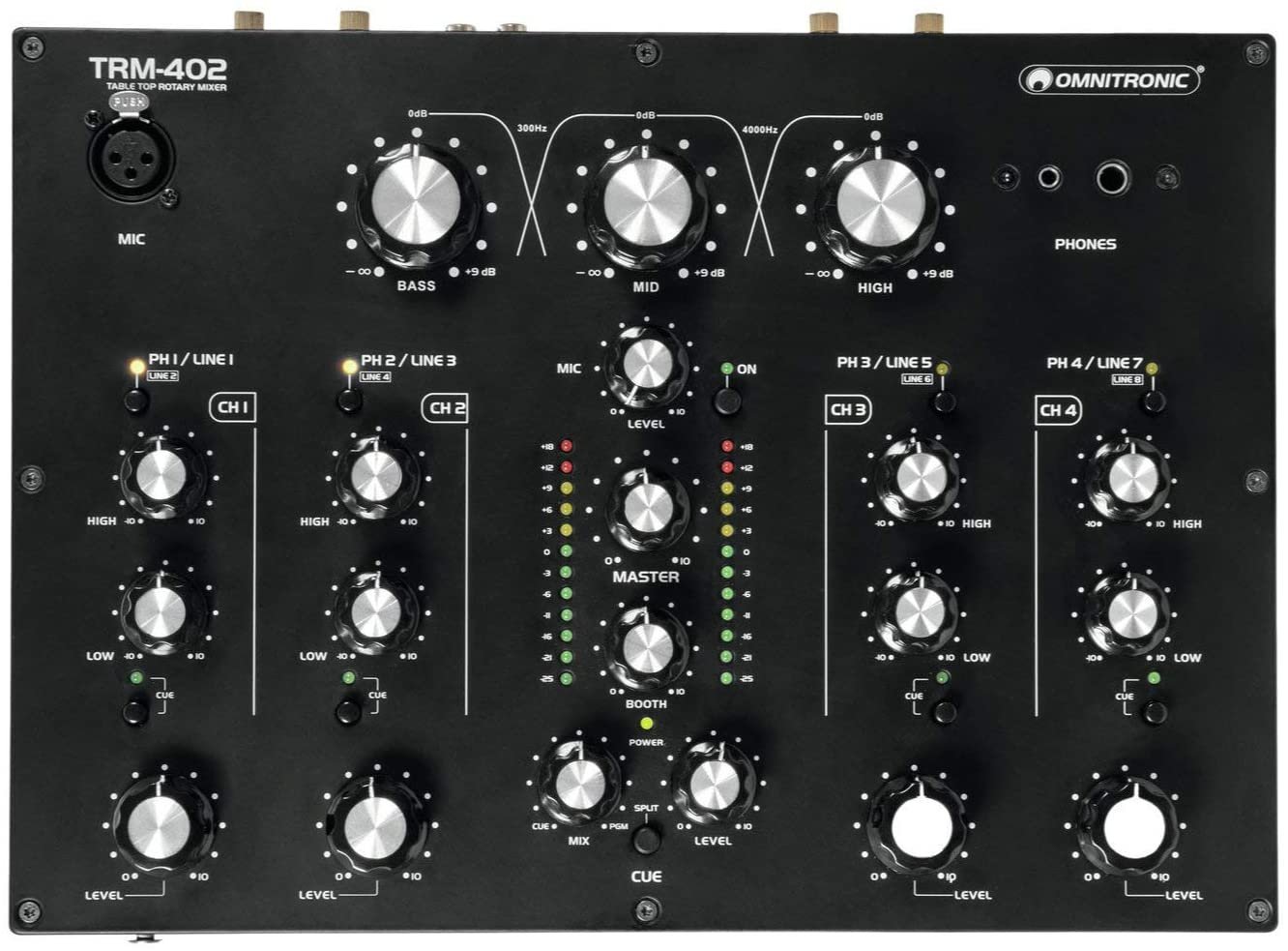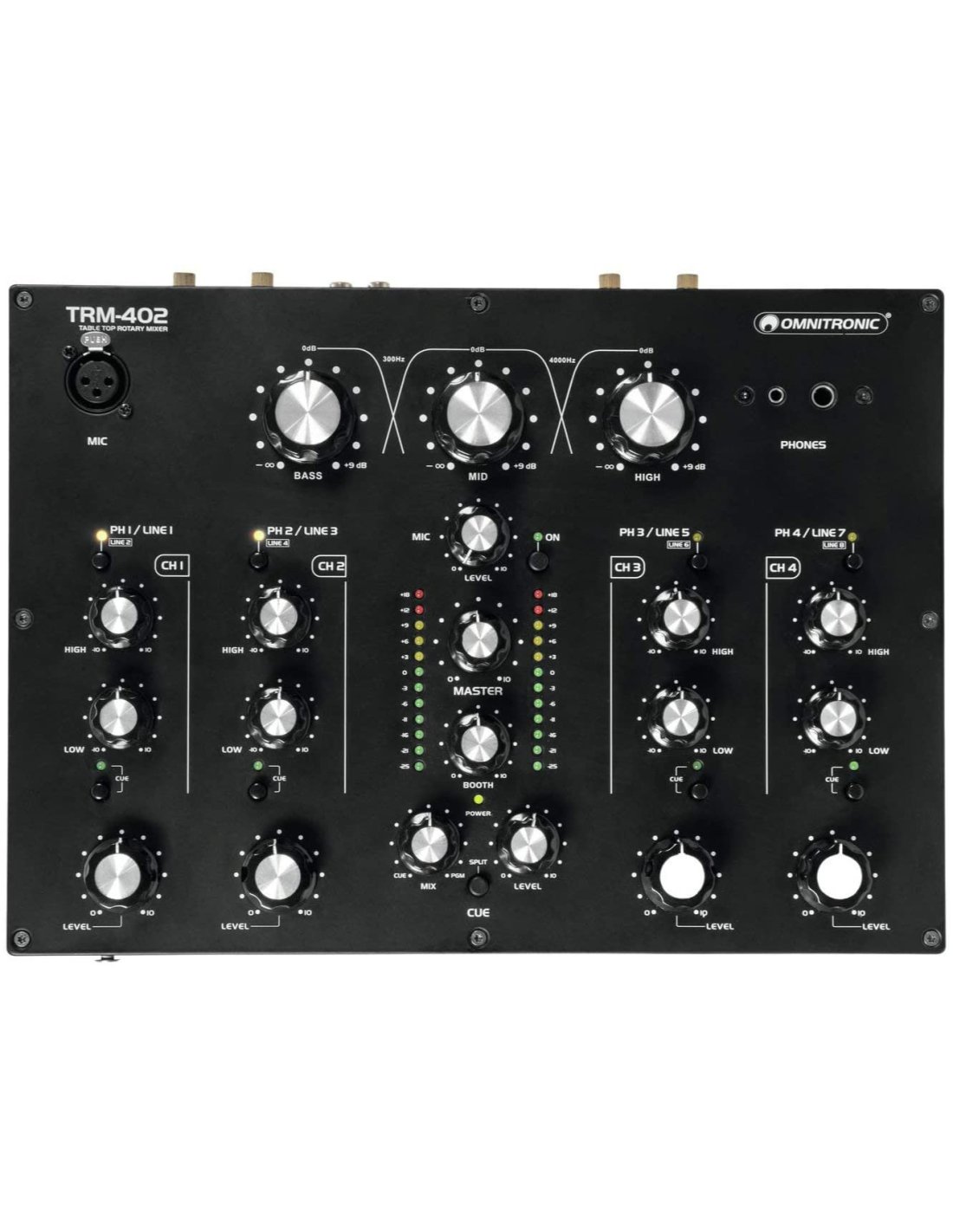 OMNITRONIC TRM402 ist ein 4-Kanal-DJ-Mixer. Die technischen Merkmale umfassen Line/Phono-Eingänge über RCA mit Gain-Kontrolle, Mikrofoneingang über XLR und Kopfhörereingang, 2-Band-Equalizer auf allen Kanälen mit Gain-Kontrolle und Line/Phono-Umschaltung, integrierten 3-Band-Frequenzisolator (Low, Mid, High), Kill Cut-Funktion, vintage ALPS-Potentiometer, 12-Stufen-LED-Meter. Es verfügt über Master- und Booth-Ausgänge über XLR und RCA sowie einen Rec-Ausgang über RCA.