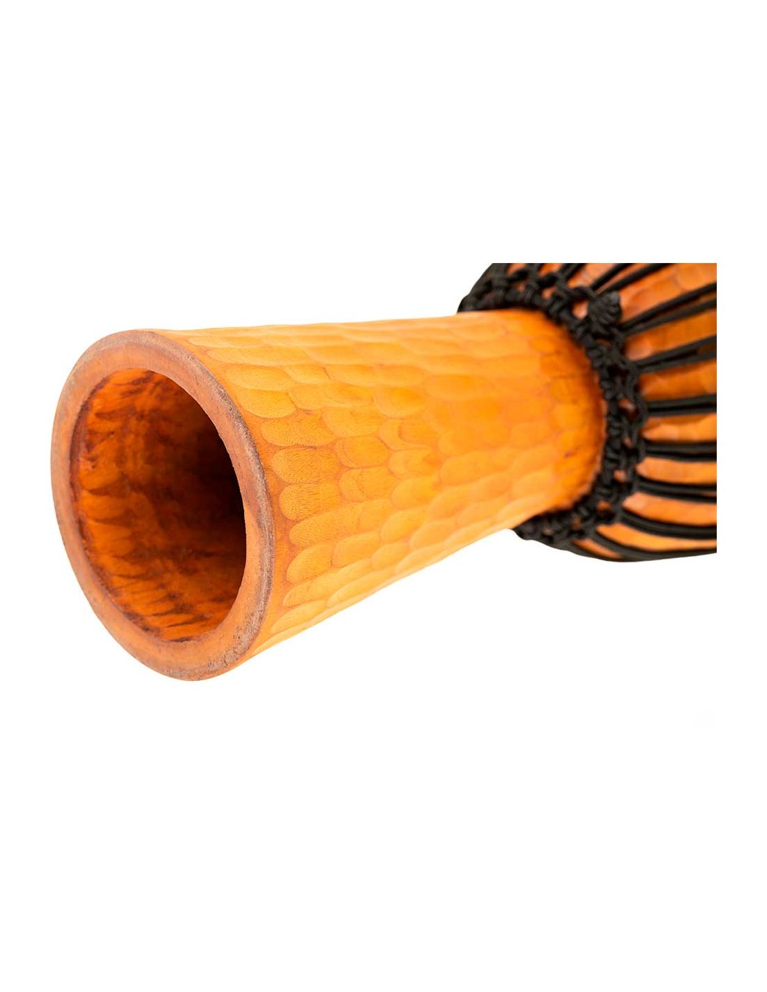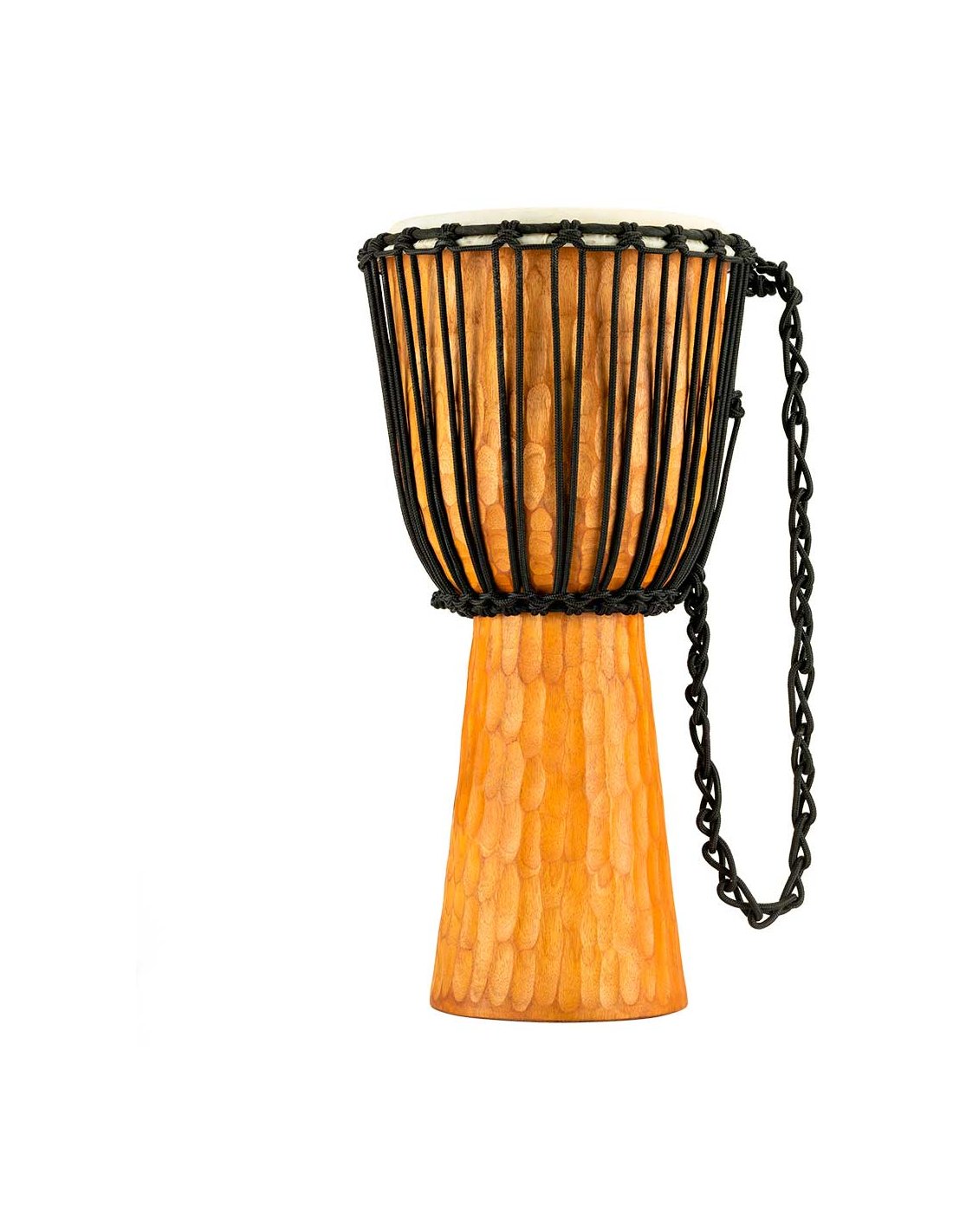'Djembe aus Holz mit 12''''. Diese Djembes sind aus einem soliden Stück Plantagen-Mahagoni gefertigt und von Hand mit einem horizontalen Wellenmuster geschnitzt, das einen fließenden Fluss suggeriert. Dies macht das Djembe auch leicht zwischen den Knien zu fixieren. Der Kopf aus handverlesenem Ziegenleder ist mit dem traditionellen Schnursystem aus Mali gestimmt.