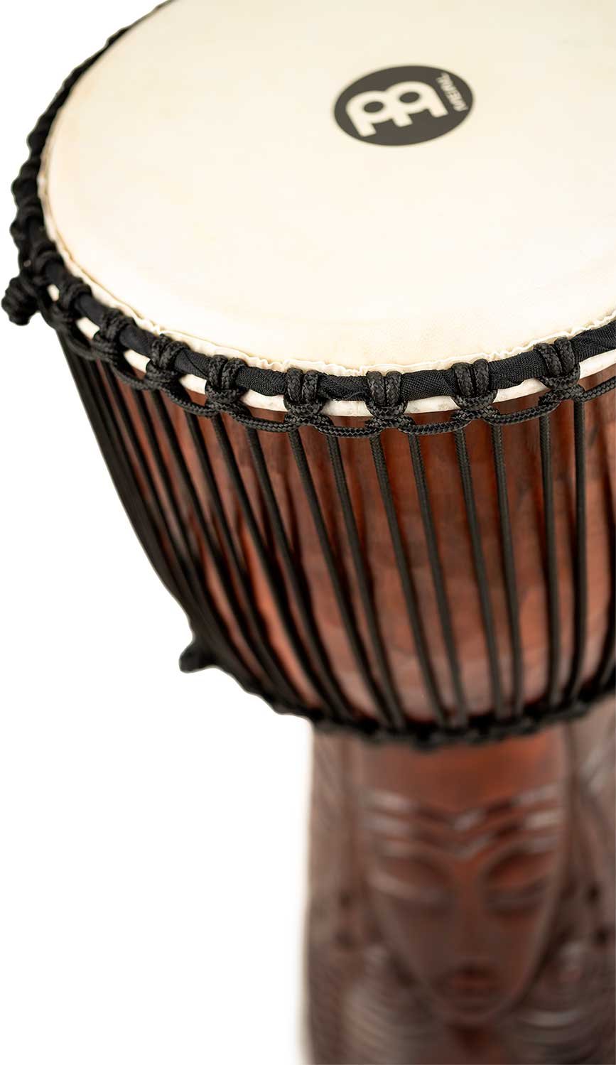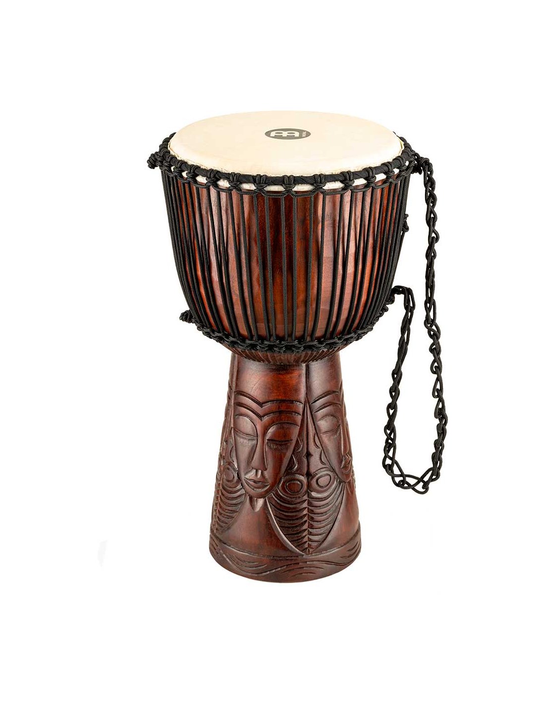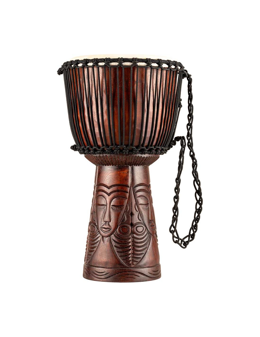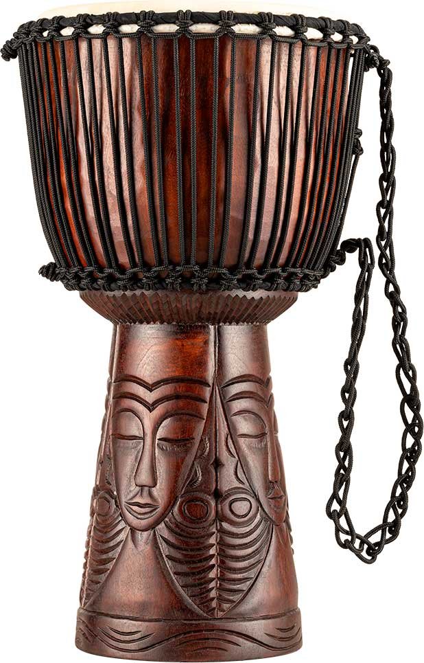 'Professionelle Djembe aus Holz in der Größe 12''''. Ausgestattet mit handverlesenen Ziegenlederfellen und Nylon-Saiten für eine optimale Stimmung. Die wunderschönen Djembes der Professionelle-Serie von Meinl zeichnen sich durch traditionell und exotisch handgeschnitzte Grafiken aus einem Stück Massivholz aus.