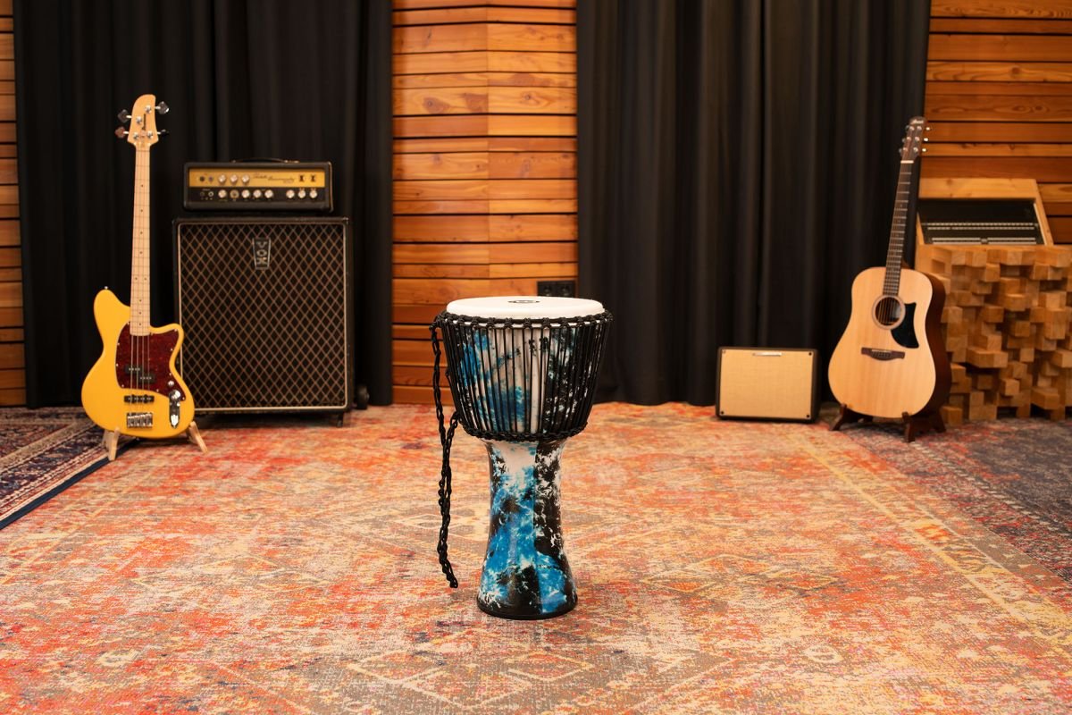 Die Meinl Rope Tuned Travel Series Djembe sind hervorragende Trommeln für Profis und für diejenigen, die einfach nur einen Nachmittag zu Hause oder mit einem Drum Circle genießen möchten. Diese patentierten Djembe sind ultraleicht (bis zu 20 % leichter als unsere Djembe aus Fiberglas) und sehr einfach zu transportieren. Die Kombination aus Leder und synthetischem Körper erzeugt hohe Slaps zusammen mit tiefen Bassklängen und macht sie perfekt für den Einsatz im Freien, da sie nicht von klimatischen Veränderungen beeinflusst werden. 100 % synthetische Felle und Korpus, perfekt für den Einsatz im FreienDas ultraleichte Gewicht macht sie ideal für ReisenVorverstreckte HTP-Nylon-SaitenErzeugt hohe Slaps zusammen mit tiefen BassklängenRutschfester Gummiboden, um die Trommel vor Kratzern zu schützenTraditionelles SaitenspannsystemDurchmesser Fell: 12" (30 cm)Höhe: 24" (61 cm)Farbe: Galactic Blue Tie Dye