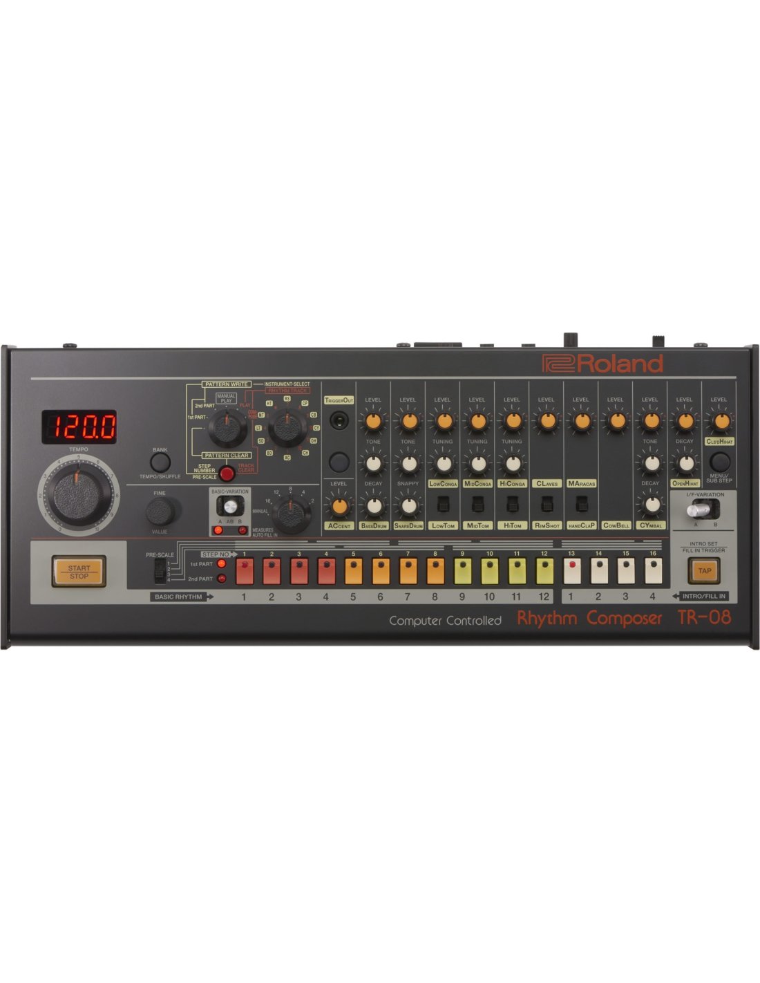 ROLAND TR-08 ist eine programmierbare Drum Machine, eine ultra-kompakte Nachbildung der Drum Machine Roland TR-808. Die technischen Merkmale umfassen Ton-, Lautstärke-, Stimmung- und Decay-Regler, Kompressorsteuerung, Gain, Tune und zusätzliche Pan-Regler für ausgewählte Instrumente, Step- und Tap-Write-Modus, 16-Step-Sequencer mit 16 Sub-Steps, LED-Kontrollanzeige, 10 separate Ausgänge über USB, dedizierter Triggerausgang, der für jede Spur auswählbar ist, um externe Instrumente zu steuern, eingebauter Mini-Lautsprecher, Stromversorgung über USB oder 4 AA-Batterien. Enthält DK-01 Boutique Dock für die Anzeige aus verschiedenen Winkeln.