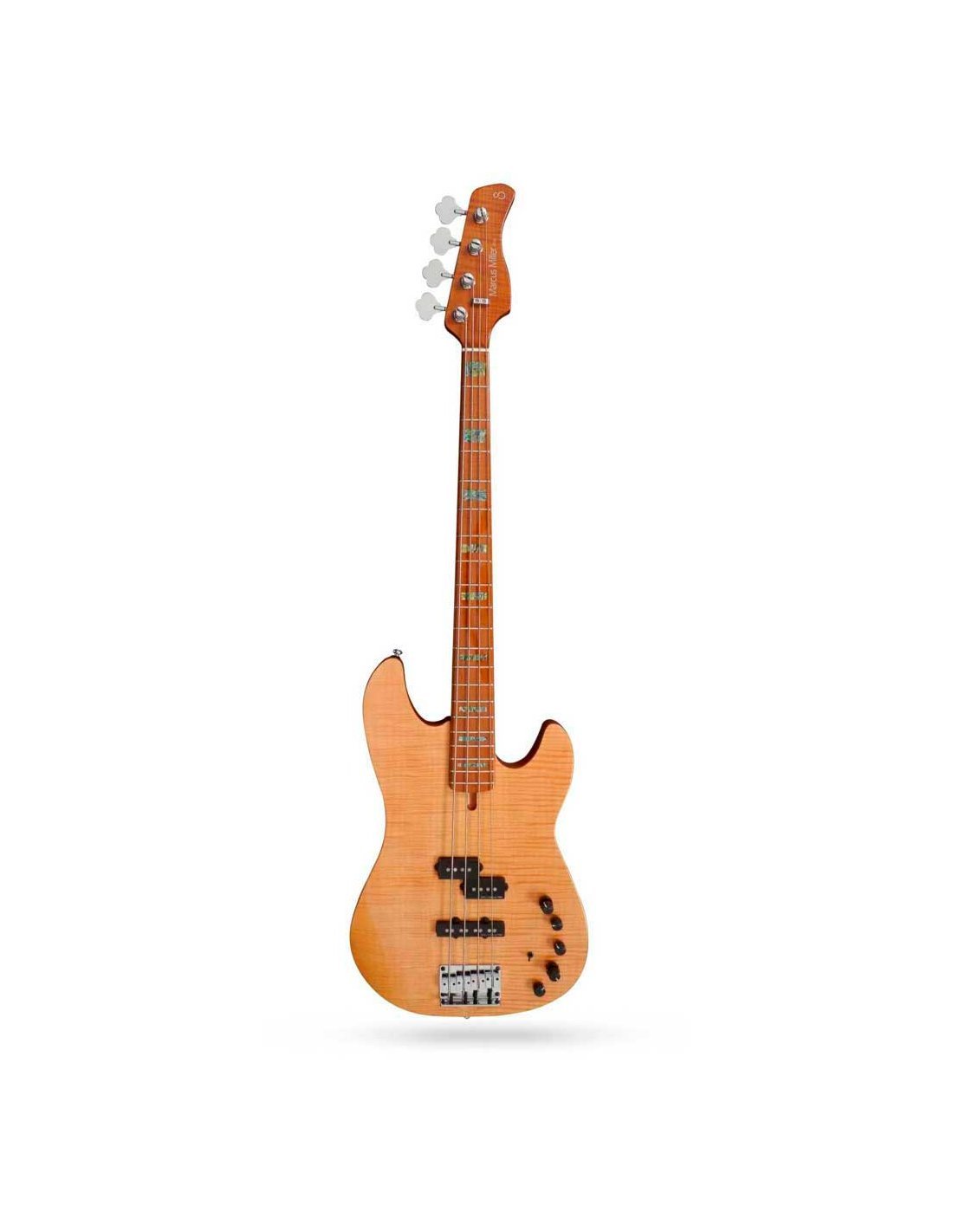 Basso Marcus Miller. 2. Generation. Korpus: Oberseite aus Ontano + Massiv-Ahorn + Maserung. Form des Korpus: Sire Precision Bass Typ. Hals: Einzelstück aus hartem Ahorn (gerösteter Ahornhals / satinierte Oberfläche). Form des Halses: C-Form. Mensur: 34”. Halsverbindung: Stahlplatte mit 4 Schrauben. Griffbrett: geflammter Ahorn (gerollte Kanten). Radius des Griffbretts: 9,5?. Bünde: 2.4 medium. Sattel: 4 Saiten – Naturknochen Breite 38mm. Einlage: Abalone Block. Tonabnehmer: Marcus Premium-J Revolution Set. Elektronik: Marcus Heritage-3 mit Mitteltonregelung. Regler: Lautstärke / Ton (Dual Pot) Pickup Blender Höhen Mittel / Mittelton (Dual Pot) Bass, Mini Toggle (aktiv / passiv). Knöpfe: Modernes schwarzes Aluminium. Brücke: Marcus Miller Heavy Mass Standard. Mechaniken: Premium Open-Gear. Oberfläche der Mechaniken: Chrom. Schlagbrett: Transparentes Schlagbrett. Natürliche Oberfläche.