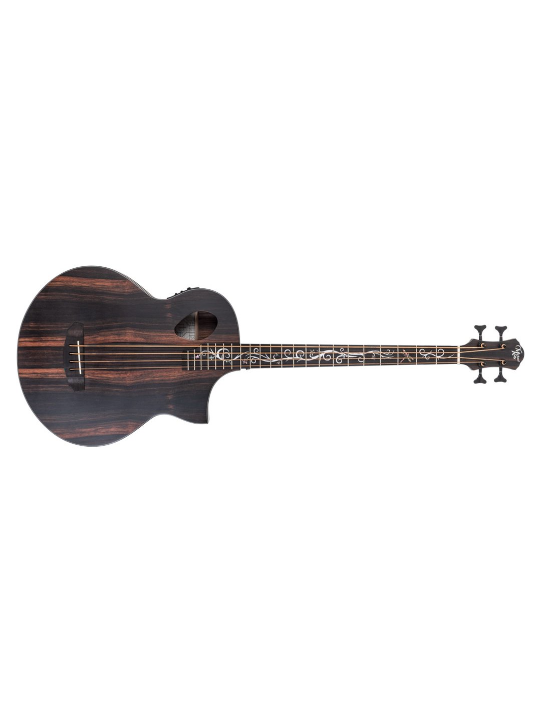 Deck, Zargen und Boden aus Makassar-Ebenholz - Bindung in 3 Schichten Weiß/Schwarz - Griff aus Mahagoni mit Standard C-Profil - Griffbrett aus Ovangkol mit einem Radius von 12'' - Steg aus Ovangkol - 22 Bünde - Sattel aus synthetischem Knochen mit 43 mm - Mensur von 34'' - Fishman Presys+ Bass Vorverstärker - MK Die-Cast Mechaniken - schwarze Hardware - D'Addario EXPPBB170 Coated Phosphor Bronze Akustik-Saiten, Long Scale, 45-100