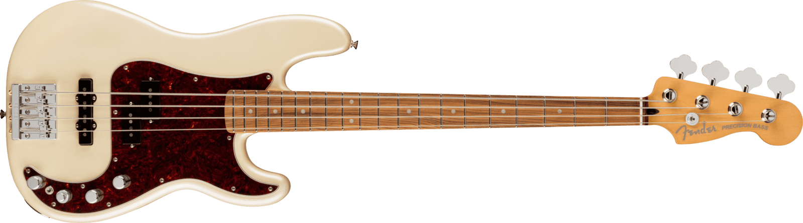 FENDER PLAYER PLUS P BASS PF OLP ist ein E-Bass mit 4 Saiten der Fender Player Plus Precision Bass Serie, hergestellt in Mexiko, mit einem Korpus aus Erle, einem Hals aus Ahorn im Modern C Shape-Profil, einem Pau Ferro-Griffbrett mit 12" Radius, 20 Medium Jumbo-Bünden und schwarzen Punkt-Inlays, einem Sattel aus synthetischem Knochen, verchromter Hardware, Standard-Truss Rod, Fender Standard Open Gear-Mechaniken und einem Fender HiMass-Brücke mit verchromten Zink-Sätteln. Die aktive/passive PJ-Elektronik besteht aus 1 Player Plus Noisless Single-Coil Jazz Bass-Pickup am Steg und 2 Player Plus Noisless Split-Coil P Bass-Pickups in der Mitte mit Lautstärke- und Tonreglern, einem 3-Band-Equalizer, einem Pickup-Pan-Pot-Schalter und einem aktiven/passiven Schalter.