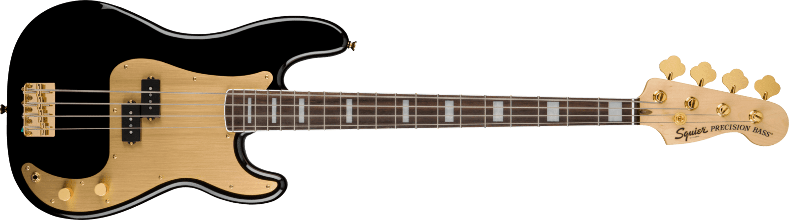Basso Elettrico Squier 40th Anniversary Precision Bass colore Black. Lo Squier 40th Anniversary Precision Bass è un basso elettrico a 4 corde. Le caratteristiche tecniche comprendono: manico in Acero, profilo a C, tastiera in Laurel con raggio 9,5", 20 tasti Jumbo. Corpo in Nyatoh con battipenna in Alluminio Anodizzato Oro. Pickup Fender Designed Alnico Split-Coil, con controlli di Volume e Tono. Hardware tipo vintage, Dorato.