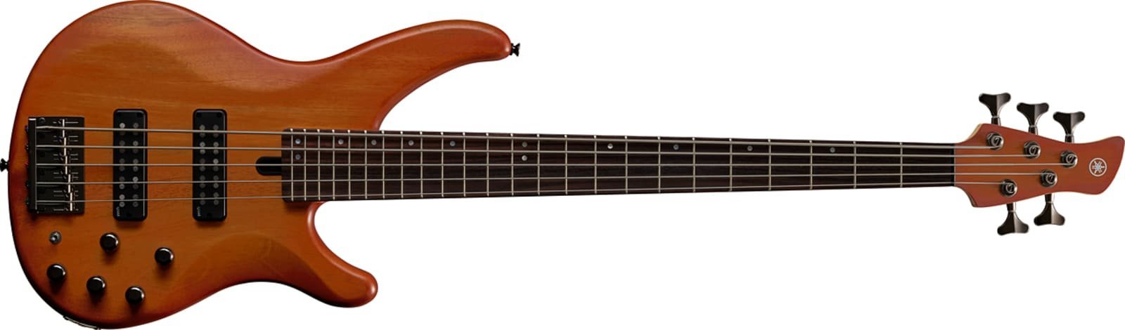 E-Bass Yamaha TRBX505 Farbe Brick Burst. Der Yamaha TRBX505 ist ein 5-saitiger E-Bass. Die technischen Merkmale umfassen einen Korpus aus Mahagoni, einen 5-teiligen Hals aus Ahorn und Mahagoni, ein Griffbrett aus Palisander, einen Radius von 23 5/8'', 24 Bünde, eine Die-cast-Brücke mit 18 mm, Pickup HHB5n (Hals) und HHB5b (Brücke), Master-Lautstärkeregler, Pickup-Balancer, Bass, Mitten, Höhen und einen Active-Passive-Schalter.