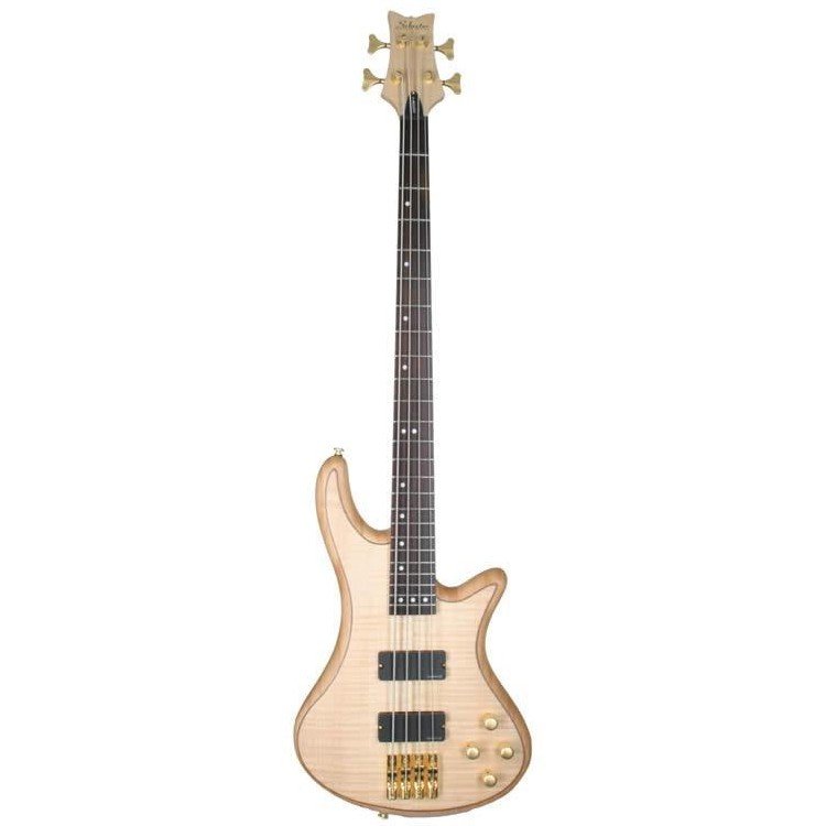 STILETTO CUSTOM-5-NAT - E-Bass 5 Saiten - Konstruktion: bolt-on - Korpus: Mahagoni und geflammte Ahorn-Decke - Hals: Ahorn und mehrschichtiges Nussbaum - Griffbrett: Palisander - Mensur: 35” - 24 X-jumbo Bünde - Einlagen: Punkte - Tonabnehmer: EMG-40 HZ - Regler: 1x Blend + 1x Lautstärke + aktiver 2-Band-Equalizer EMG - Brücke: S-Tek - Mechaniken: Schecter - Hardware-Finish: satinierte Goldfarbe - Sattel: Graph Tech - Farbe: Naturholz - Finish: satiniert.