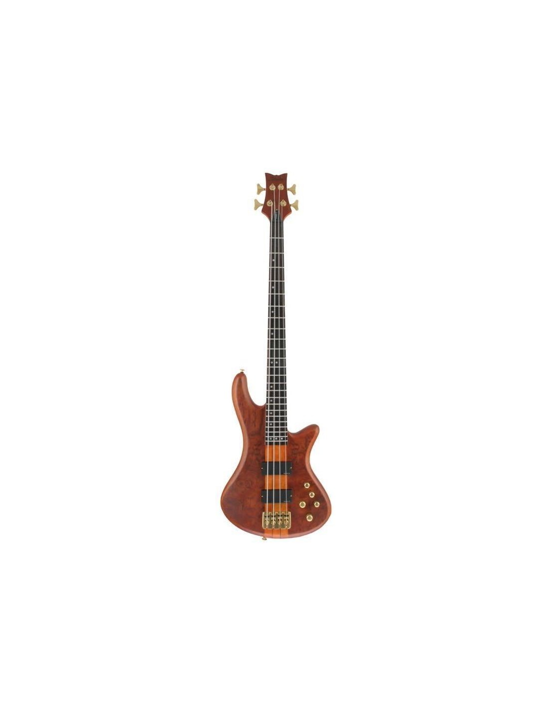 STILETTO STUDIO-4-HSN - E-Bass 4 Saiten - Struktur: neck-thru mit ultra Zugang - Körper: Mahagoni und Bubinga-Top - Hals: Ahorn und mehrschichtiges Walnuss - Griffbrett: Palisander - Mensur: 34” - 24 X-jumbo Bünde - Einlagen: Punkte - Tonabnehmer: EMG-35 HZ - Regler: 1x Blend + 1x Lautstärke + aktiver 3-Band-Equalizer EMG 18v - Brücke: Diamond Custom - Mechaniken: Schecter - Hardware-Finish: satinierte Goldfarbe - Sattel: Graph Tech - Farbe: Honig - Finish: satiniert.