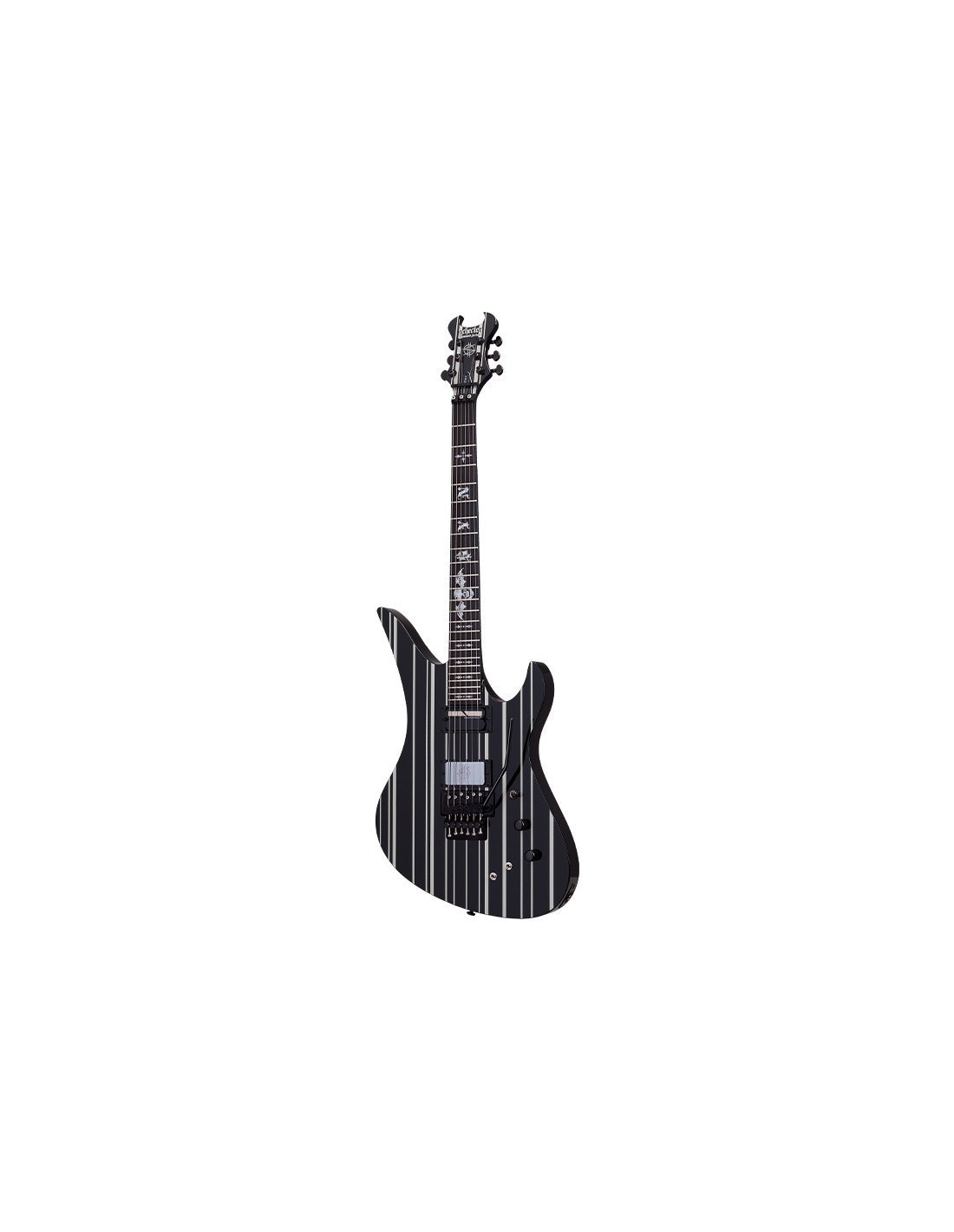 SYNYSTER GATES SIGNATURE CUSTOM S BLK/SILV - E-Gitarre 6 Saiten - Konstruktion: Set-Neck mit Ultra Access - Korpus: Mahagoni - Hals: Mahagoni mit Carbonfaser-Verstärkungen - Griffbrett: Ebenholz - Mensur: 25,5” - 24 X-Jumbo Bünde - Einlagen: “SYN” + “Death Bat” am XII. Bund - Binding: schwarz - Tonabnehmer: 1x Schecter Custom Shop Synyster Gates Signature Humbucker + 1x Sustainiac - Regler: 1x Lautstärke + 1x Ton (Push/Pull) + 3-Wege-Wahlschalter + Sustainiac-Schalter (Ein/Aus) + Sustainiac-Modus-Schalter (Fundamental-Mix-Harmonic) - Bridge: Floyd Rose 1500 - Mechaniken: Grover Rotomatic 18:1 - Hardware-Finish: Schwarz - Sattel: Floyd Rose 1500 - Farbe: Schwarz mit grau-metallischen Streifen - Finish: Hochglanz.
