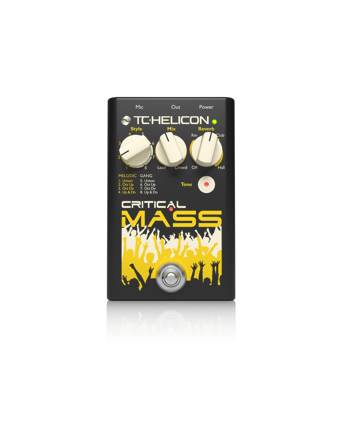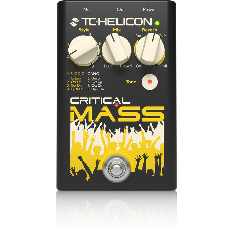 TC Helicon Critical Mass ist ein Gesangspedal, das einen Choreffekt zur Hauptstimme hinzufügt. Es verfügt über 4 verschiedene Chormodi, Melodic oder Gang, 3 Hallfunktionen, dynamische Korrektur, Sprachreinigung (adaptive automatische Equalizer), De-Esser und Phantomspeisung.