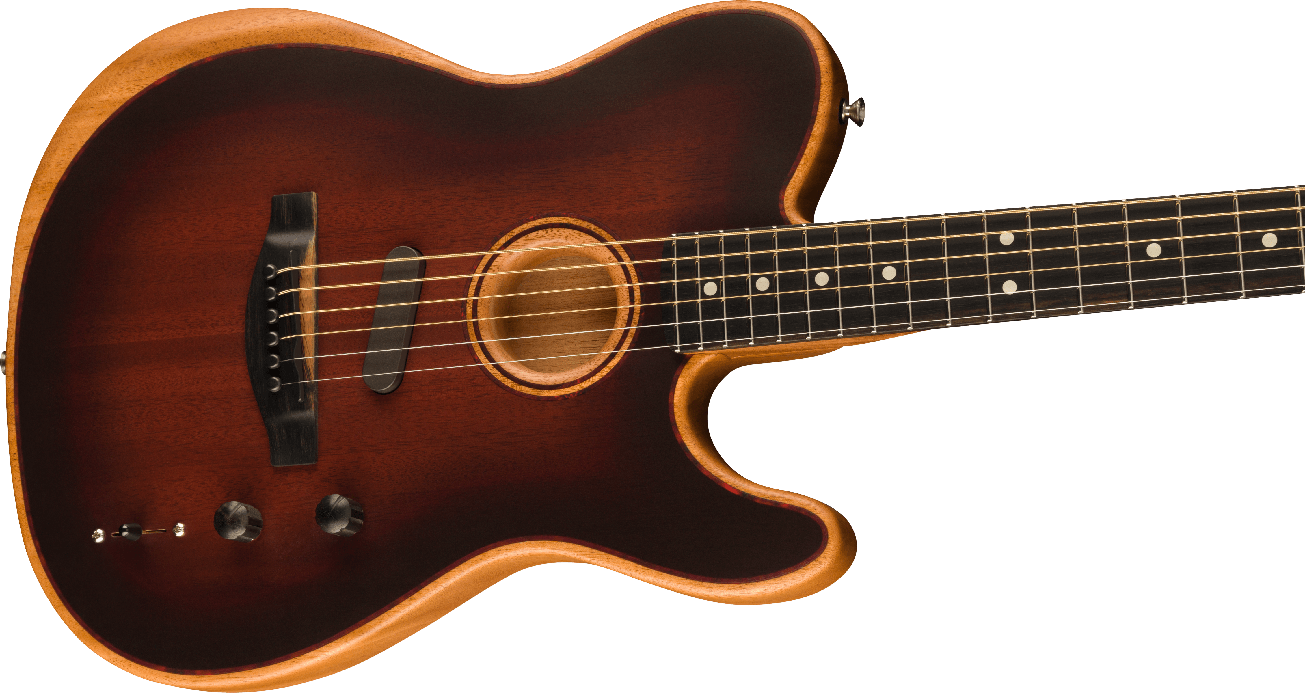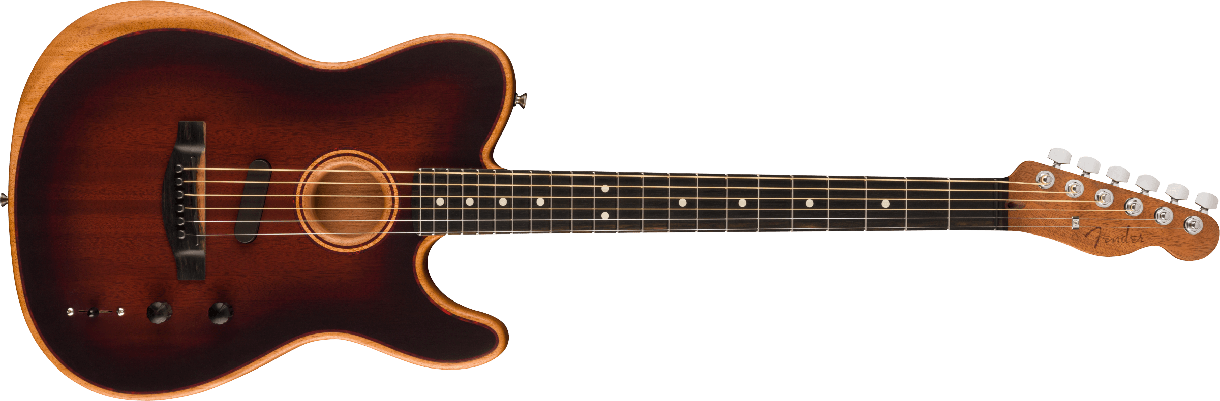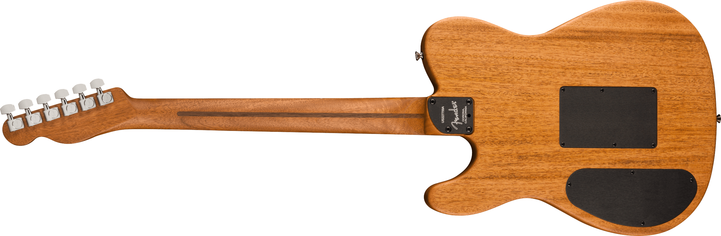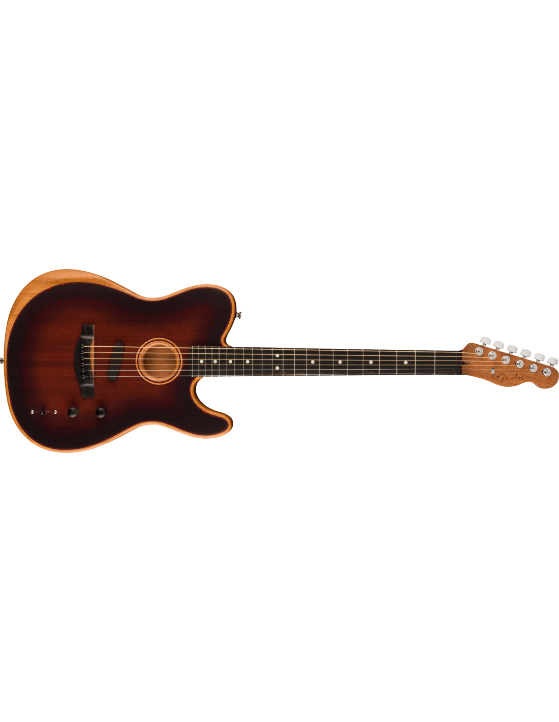 FENDER ACOUSTASONIC TELE ALL MAHOGANY ist eine hybride E-Gitarre/Akustikgitarre, Modell Acoustasonic Player Telecaster Limited Edition, vollständig aus Mahagoni gefertigt, mit einem Hals im Modern Deep "C" Profil, einem 12" Radius Ebenholzgriffbrett mit 22 Narrow Tall Bünden und White Dots Einlagen, Bi-Flex Truss Rod, Graph Tech TUSQ Sattel, verchromte Hardware, Fender Standard Cast/Sealed Staggered Mechaniken mit Single-Wing Saitenhalter und Modern Asymmetrical Bridge. Die Elektronik mit 3 Pickup-Konfigurationen und der Stringed Instrument Resonance System (SIRS) Technologie, die mit einer 9V-Batterie betrieben wird, besteht aus 1 externem Fender Acoustasonic Noiseless Pickup, einem Fishman Piezo unter dem Sattel und einem internen Sensor im Korpus, mit Master Volume, Blend-Regler und einem 5-Wege-Pickup-Wahlschalter, der die Auswahl von akustischen und elektrischen Klangfarben ermöglicht. Inklusive Deluxe 1225 Gig Bag