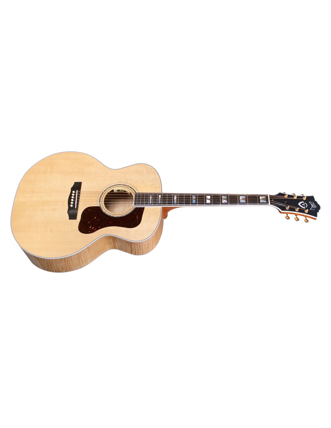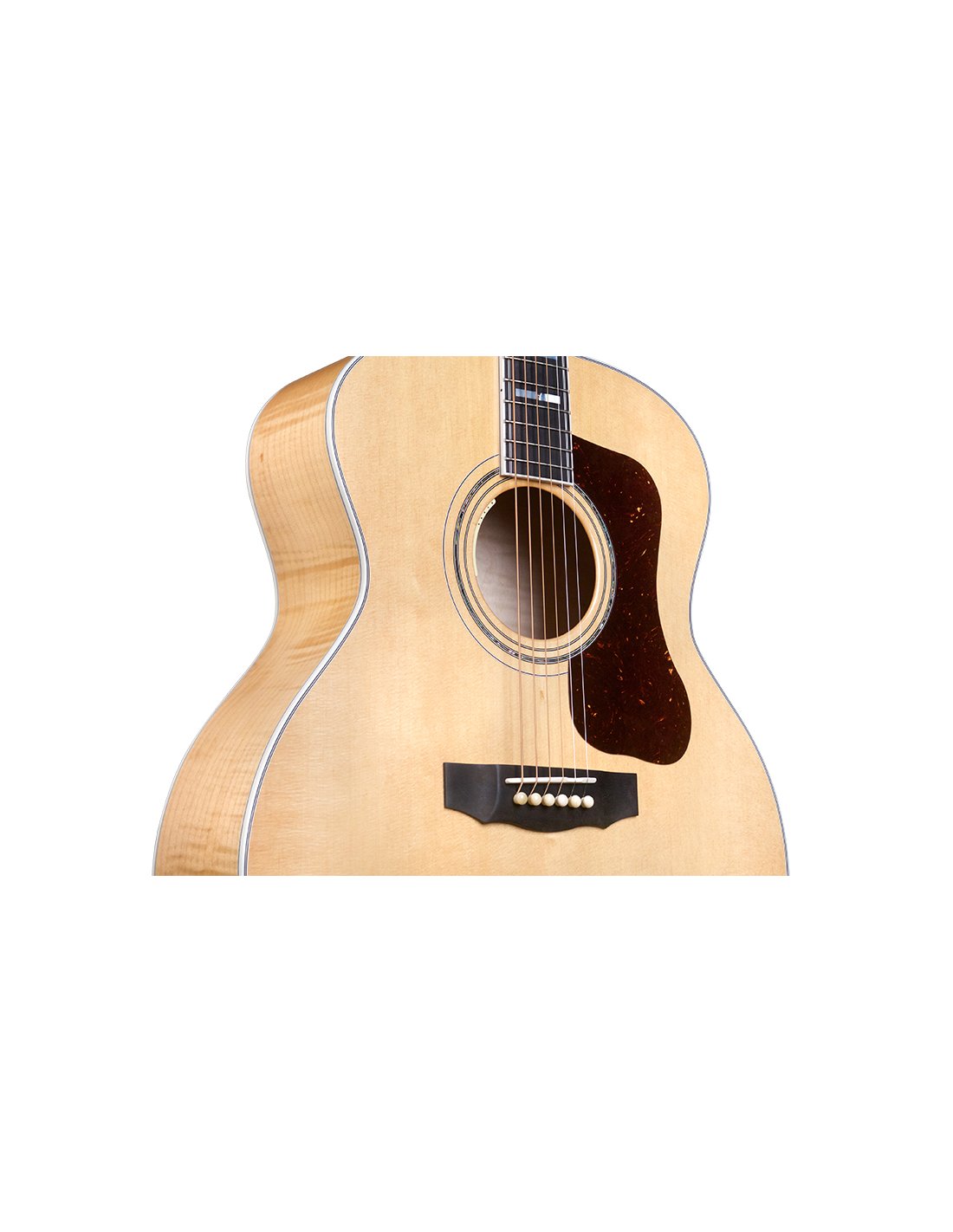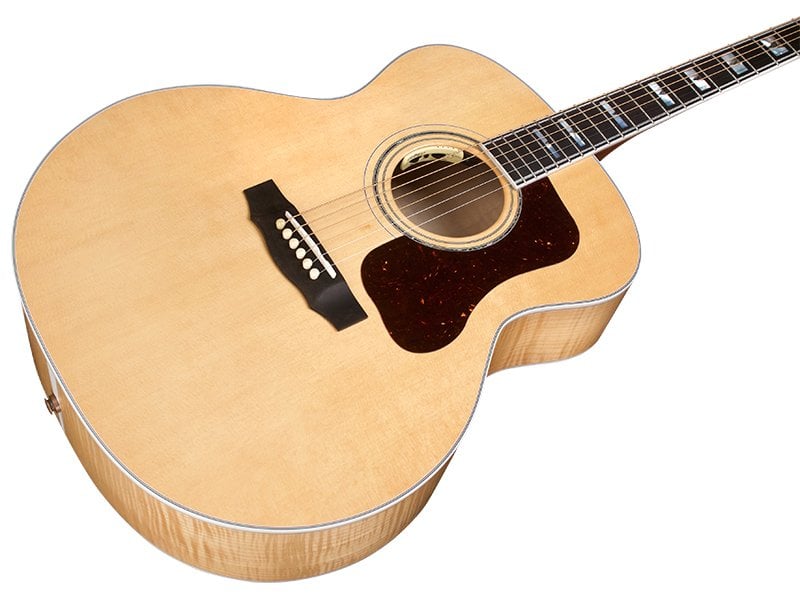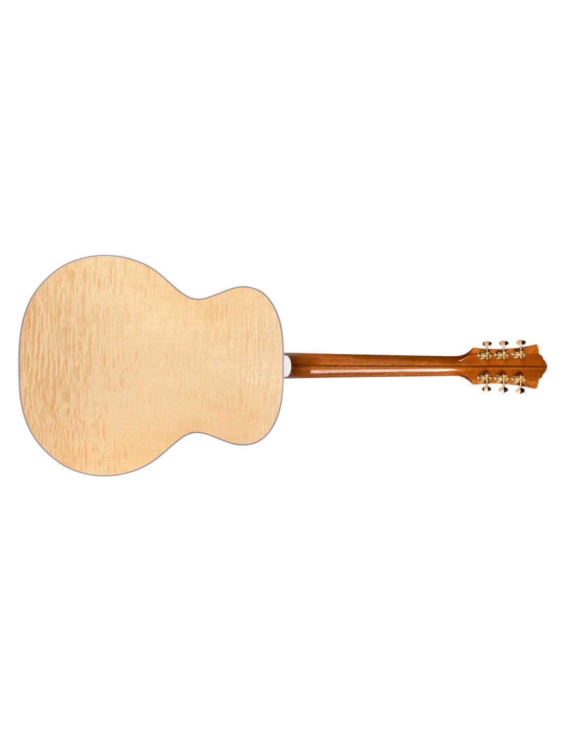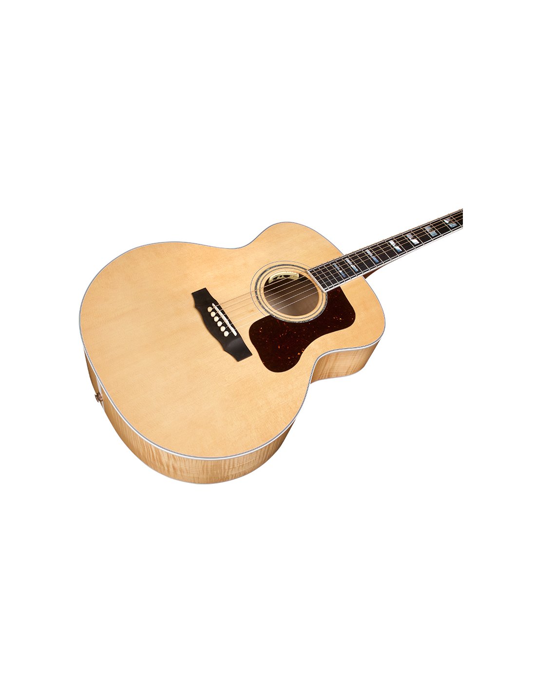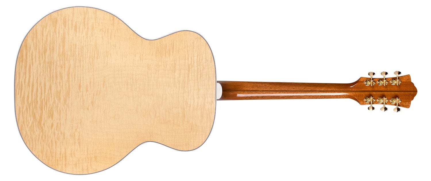 Die endgültige Jumbo-Gilde ist hier: F-55 Maple, hergestellt in den USA, verfügt über eine Decke aus ausgewähltem massiven Sitka-Fichtenholz mit einem gewölbten (Arched) Boden aus geflammtem Ahorn und geflammten Ahornseiten. Hergestellt auf der Bogenpresse, die seit 1985 in der Guild-Fabrik vorhanden ist, bietet die F-55 Maple definierte und brillante Höhen sowie einen artikulierten Mittelbereich, der perfekt für einen harfenähnlichen Klang ist, der von Musikern sehr geschätzt wird. Der Ahorn zeichnet sich durch seine Eigenschaften aus und hebt sich von anderen Hölzern durch die hervorragende Kontrolle der mittleren und tiefen Frequenzen sowie eine ausgeprägte Persönlichkeit in den hohen Frequenzen ab. Die eleganten Verzierungen umfassen die klassischen Guild-Inlays „V-block“ auf einem Ebenholzgriffbrett, den Mahagonihals mit C-Profil in drei Teilen und einer zentralen Verstärkung aus Walnuss (Walnut), der Sattel aus Knochen ist 43 mm breit, der Maßstab des Instruments beträgt 651 mm, die Binding und Purfling sind aus ABS, goldene Hardware, die offenen goldenen Gotoh SE700 Mechaniken vervollständigen die Ausstattung, eine wunderschöne glänzende Nitrocellulose-Lackierung in Natur und die hervorragende Bauqualität machen dieses Instrument zu einer der interessantesten Jumbos von Guild. Das Verstärkungssystem ist L.R. Baggs Anthem. Die Gitarre wird mit einem harten Holzkoffer von Guild mit einem Humicase®-Befeuchtungssystem geliefert.