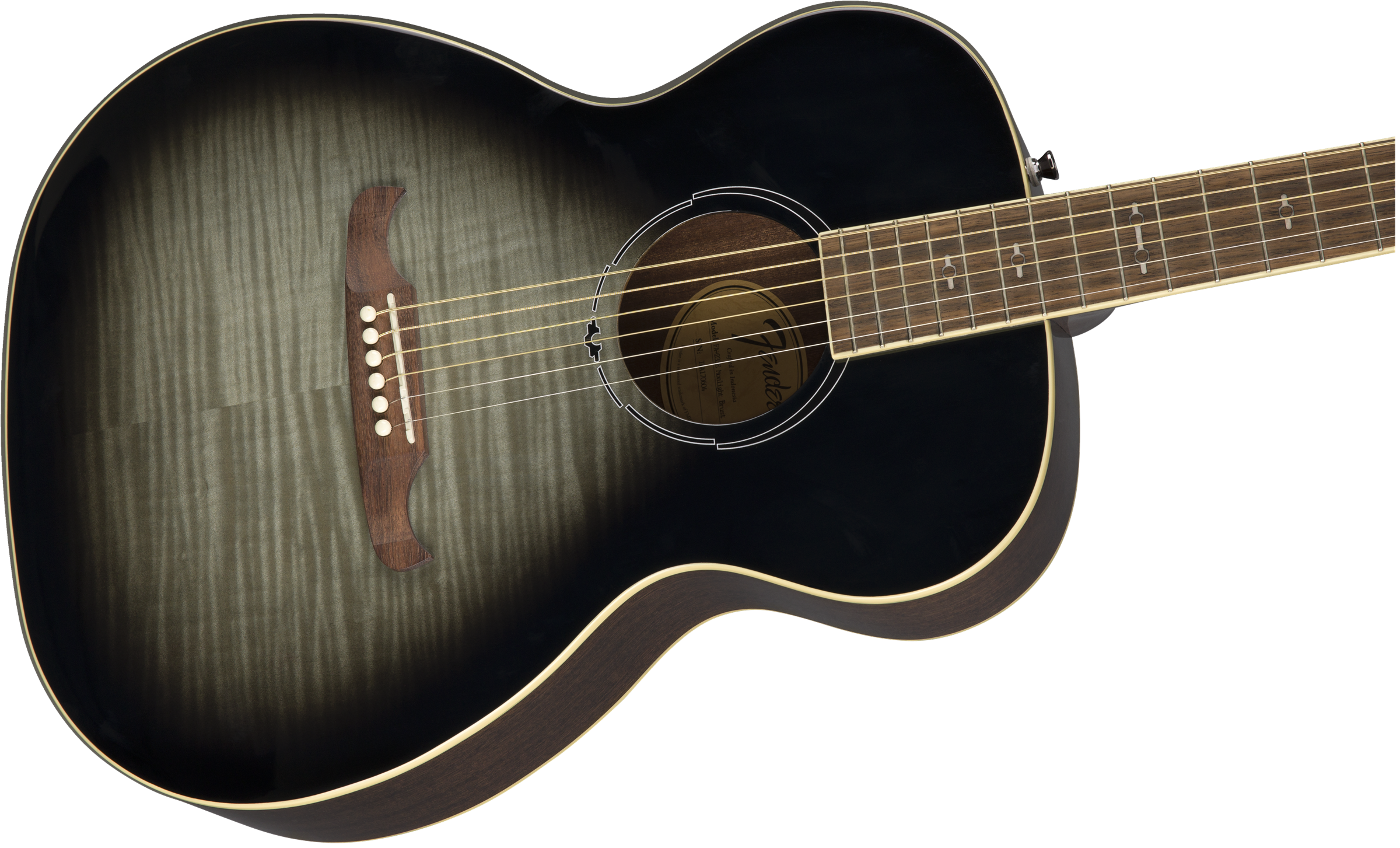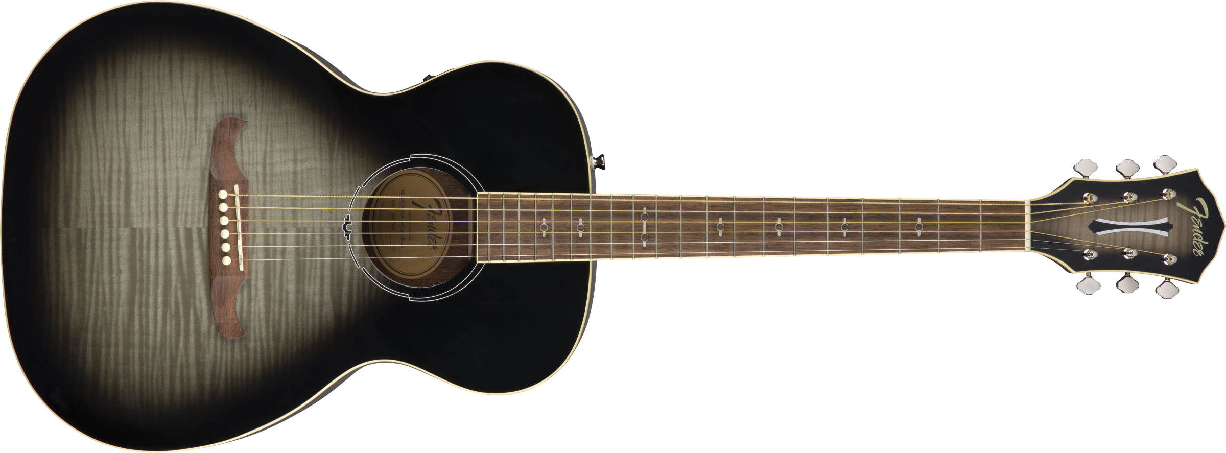 FENDER FA-235E CONCERT MOONLIGHT BURST ist eine akustische E-Gitarre im Konzertformat, Modell FA-235E, mit Boden und Zargen aus laminiertem Mahagoni, Decke aus laminiertem geflammtem Ahorn, Hals aus Nato mit glänzender Urethan-Oberfläche, Griffbrett aus Walnuss mit einem Radius von 11,81" und 20 Bünden von 2 mm sowie Pearloid Keystone Einlagen, Sattel aus Graph Tech TUSQ, Hardware in Chrom, Fender Open Back Mechaniken 3+3 und einer Viking-Brücke aus Walnuss. Die Elektronik besteht aus einem Fishman CD-1 Preamp-System mit integriertem Tuner, Lautstärkeregler, Bass-, Höhenregler und einem piezoelektrischen Unter-Sattel-Pickup.