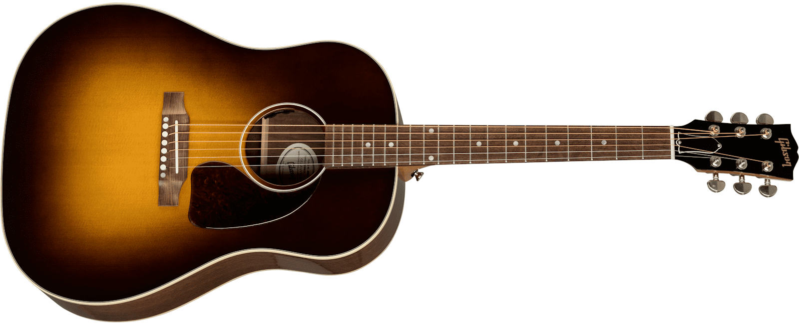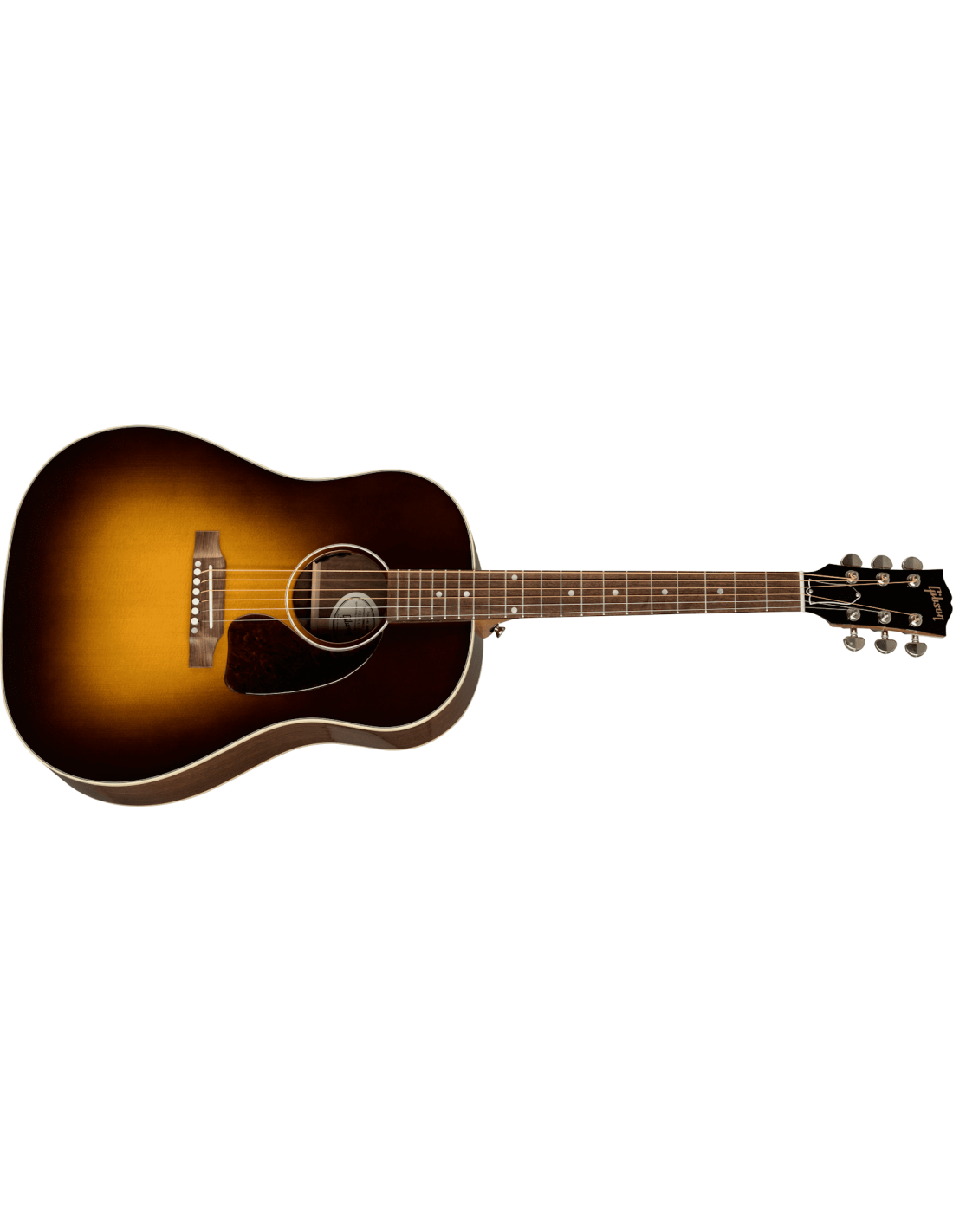 GIBSON J-45 STUDIO WALNUT BURST. Akustikgitarre Modell J45 Studio mit Sitka-Fichtendecke, Boden und Zargen aus Walnuss, Mahagonihals mit Advanced Response-Profil, Ebenholzgriffbrett mit 12" Radius und 20 Standardbünden, Hals-Korpus-Verbindung in Schwalbenschwanzform, Sattel aus Tusq, Dot-Inlays aus Perlmutt, Grover Rotomatic Mechaniken mit Kidney-Buttons und goldener Hardware, traditioneller Belly up Steg und Tropfen-Schlagbrett. Die Elektronik besteht aus einem Fishman Sonitone Satteltonabnehmer mit Lautstärke- und Toneinstellungen.