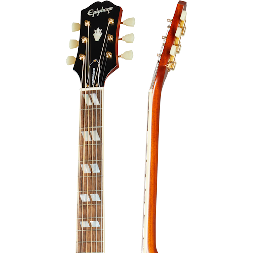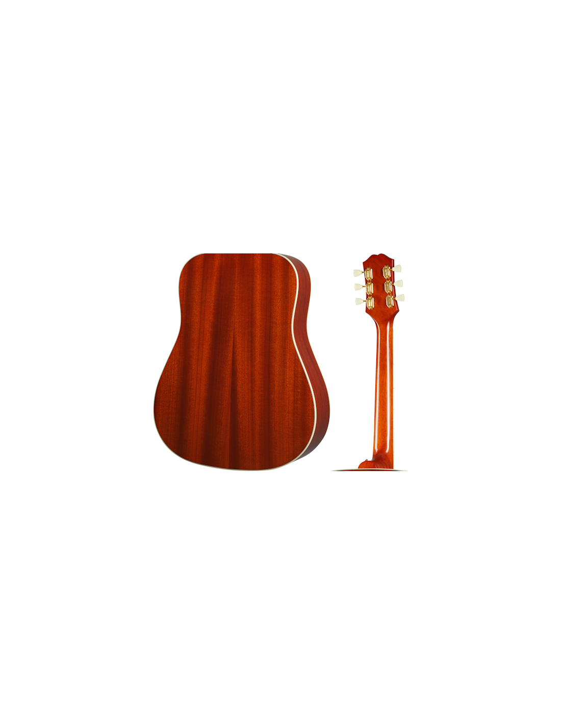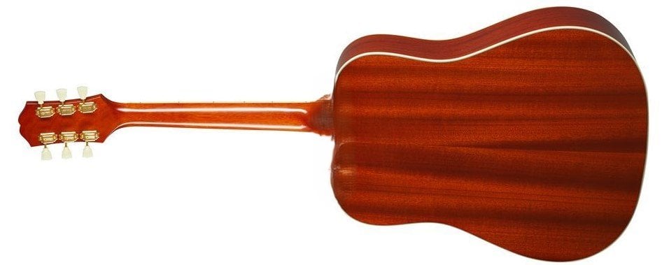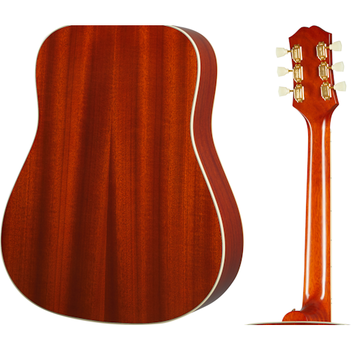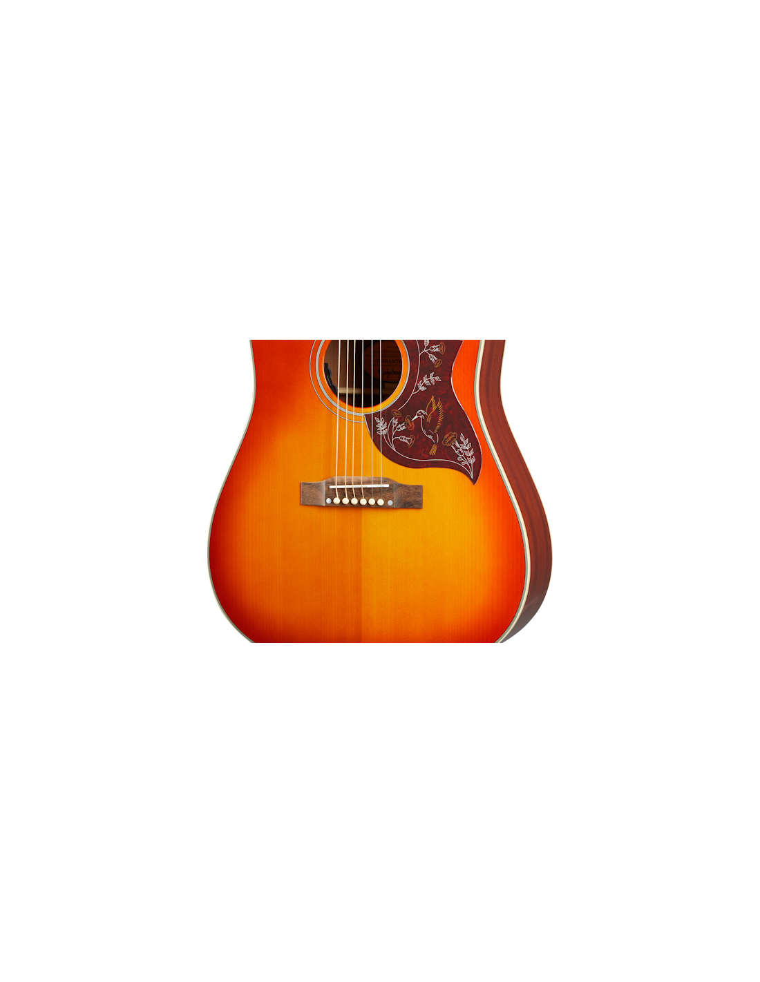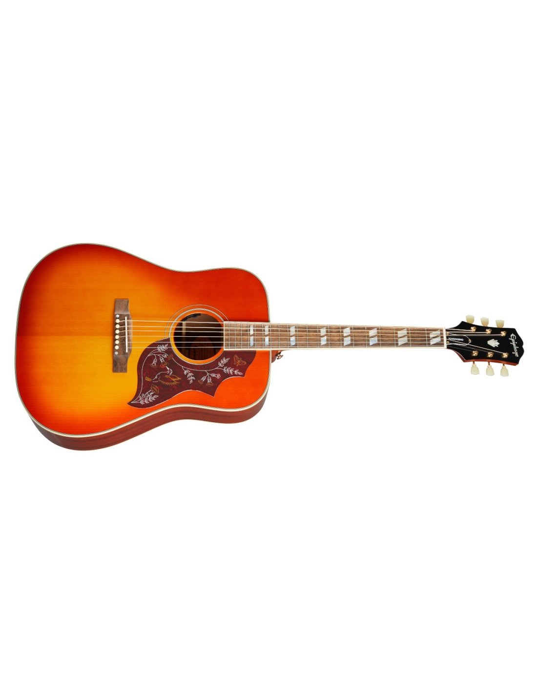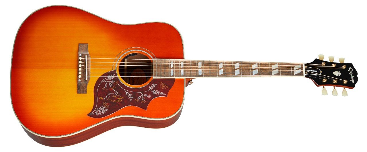EPIPHONE HUMMINGBIRD ACH ist eine elektrifizierte Akustikgitarre des Modells Epiphone Hummingbird im Dreadnought-Format mit quadratischer Schulter, aus massivem Mahagoni für Korpus, Boden und Zargen, massivem Sitka-Fichten-Top, viertelgeschnittenem Fichten-Bracing, einem Mahagonihals mit Rounded C-Profil, einer Hals-Korpus-Verbindung in Form einer Schwalbenklaue, einem 12"-Radius-Griffbrett aus indischem Lorbeer mit 20 Medium Jumbo-Bünden und Doppelpaar-Perlmutt-Einlagen, einem Sattel aus Knochen, einem Truss Rod mit doppelter Aktion, Epiphone Deluxe-Mechaniken mit goldenen Druckbuchsen und einer Reverse Belly-Brücke aus indischem Lorbeer mit einem Sattel aus Knochen. Die Elektronik besteht aus einem Fishman Sonitone-Vorverstärker und einem Unter-Sattel-Pickup mit Lautstärke- und Toneinstellungen an der Schallloch.